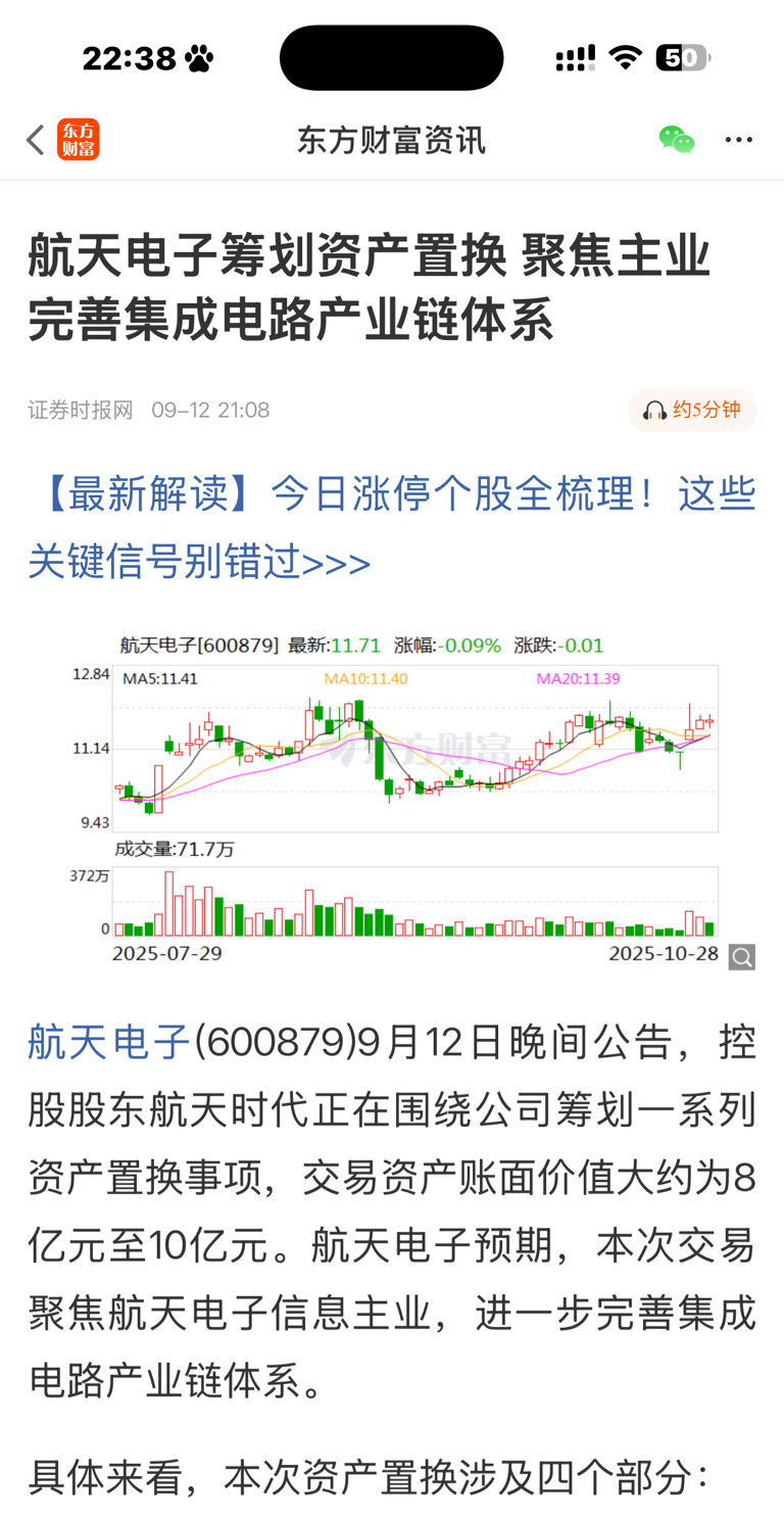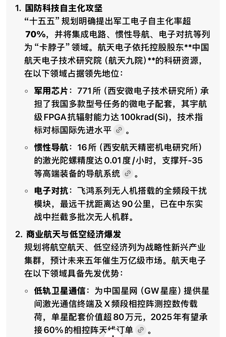 $航天电子(SH600879)$ 航天电子聚焦集成电路,量子科技,星间激光通信,航电系统,电子对抗,虽然十年都被压制在12以下,预计跟着国家十五五规划明确提出军工电子自主化率超70%,并将集成电路、惯性导航、电子对抗等列为“卡脖子”领域。航天电子依托控股股东中国航天电子技术研究院(航天九院)的科研资源整合上市公司