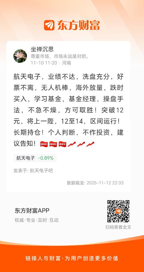 航天电子,业绩不达,洗盘充分,好票不离,无人机棒,海外放量,跌时买入,学习基金,基金经理,操盘手法,不急不燥,方可取胜!突破12元,将上一陛,12至14,区间运行!长期持仓!个人判断,不作投资,建议告知!