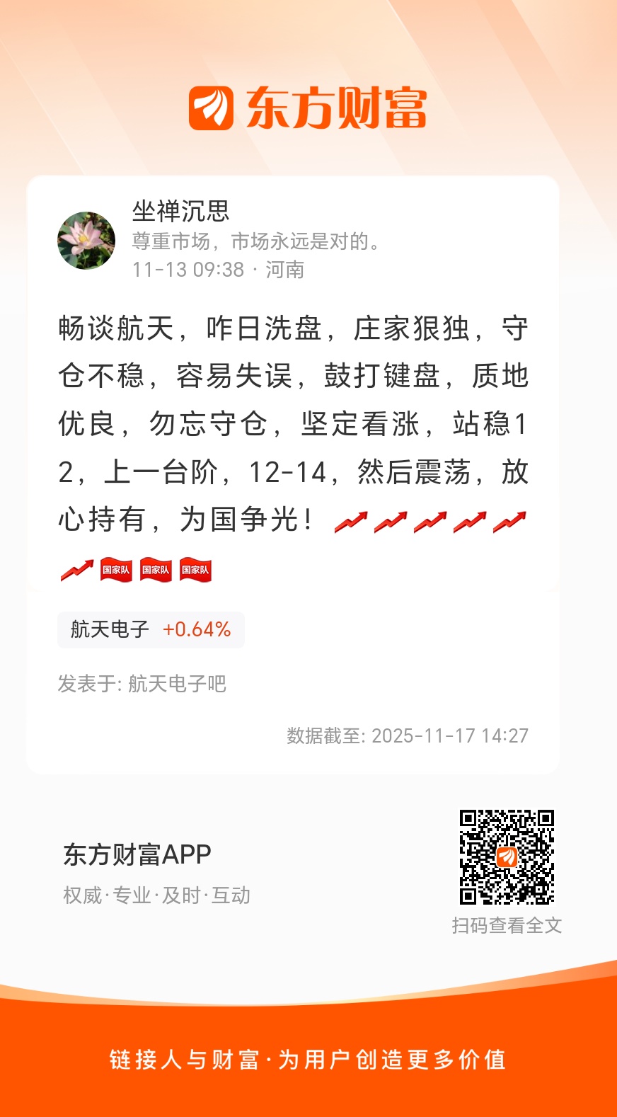 畅谈航天,咋日洗盘,庄家狠独,守仓不稳,容易失误,鼓打键盘,质地优良,勿忘守仓,坚定看涨,站稳12,上一台阶,12-14,然后震荡,放心持有,为国争光!