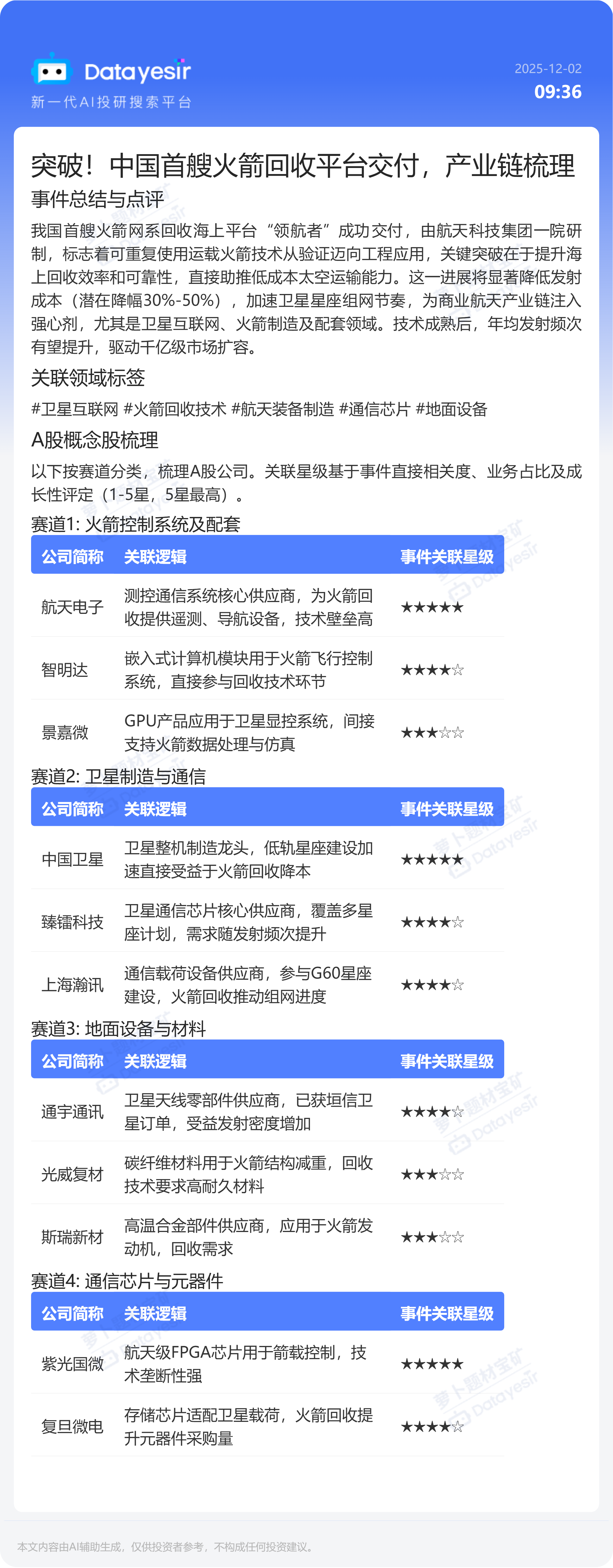突破!中国首艘火箭回收平台交付,产业链梳理