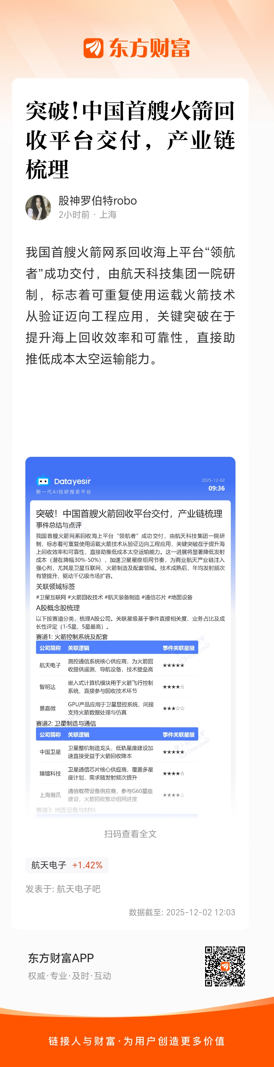 我国首艘火箭网系回收海上平台“领航者”成功交付,由航天科技集团一院研制,标志着可重复使用运载火箭技术从验证迈向工程应用,关键突破在于提升海上回收效率和可靠性,直接助推低成本太空运输能力。