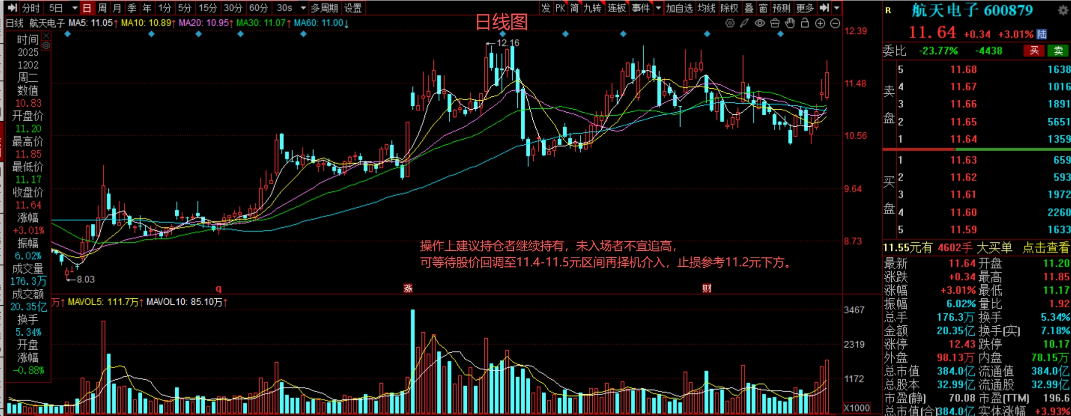 当前股价11.64元,上涨3.01%,表现强势。技术面看,股价放量突破所有中短期均线压制,5日线(11.05元)与20日线(10.95元)构成下方支撑,均线系统呈多头排列。操作上建议持仓者继续持有,未入场者不宜追高,可等待股价回调至11.4-11.5元区间再择机介入,止损参考11.2元下方。