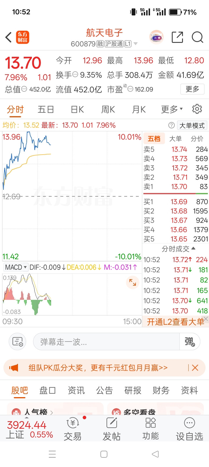 $航天电子(SH600879)$ 早上12.8-13附近上车的兄弟,继续拿好等待!没进的不要灰心,我们还有机会,抱团取暖,一起努力!!