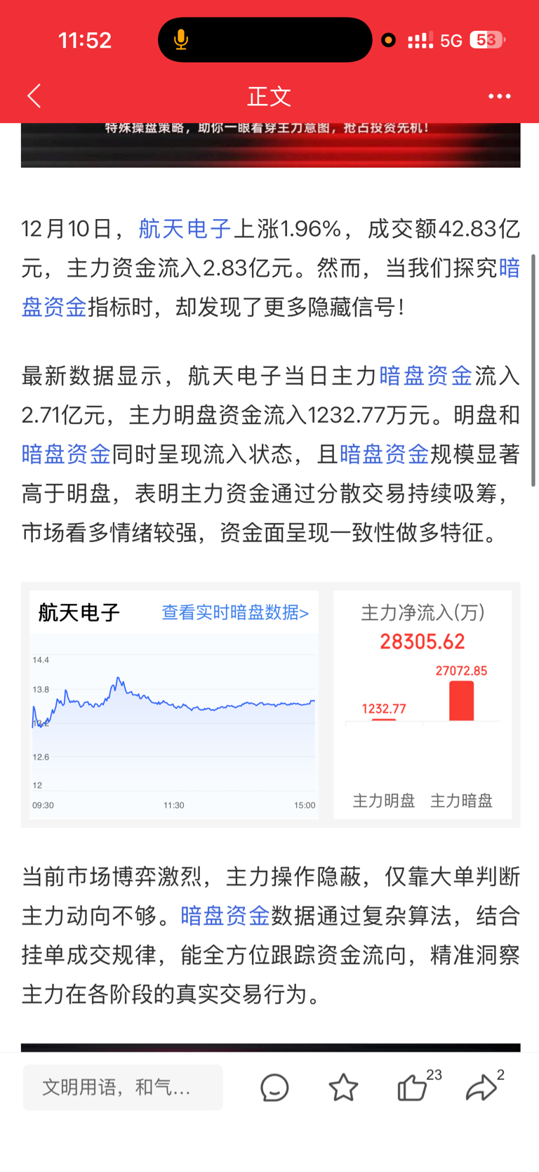 $航天电子(SH600879)$ 散户快卖,我跟随主力加仓;耐心持有