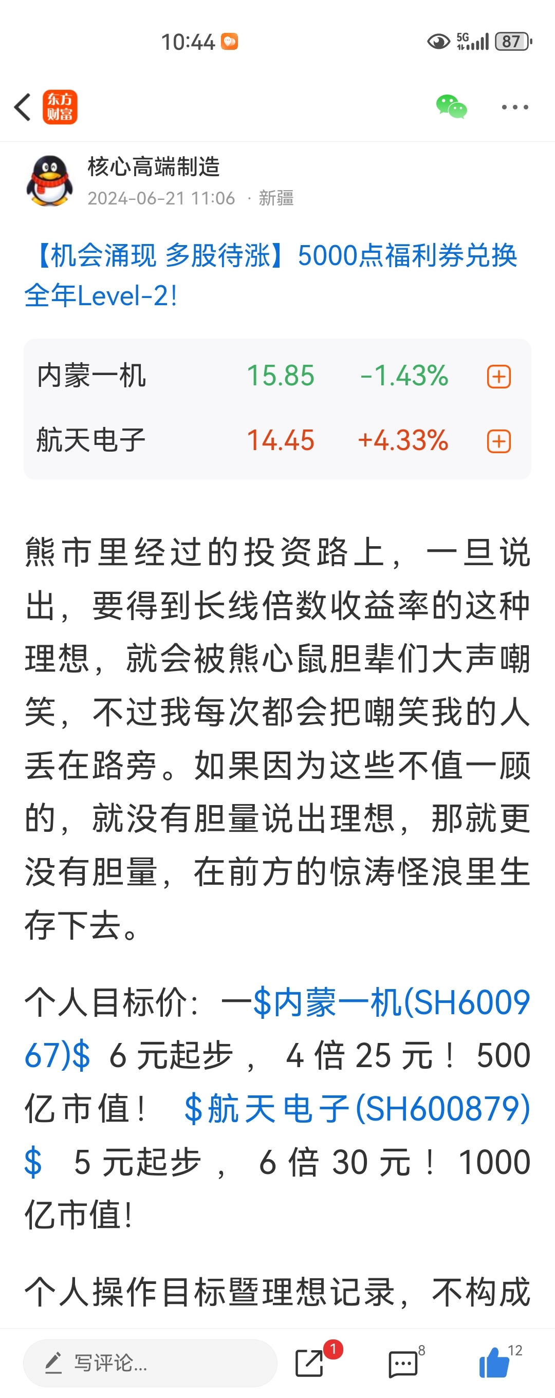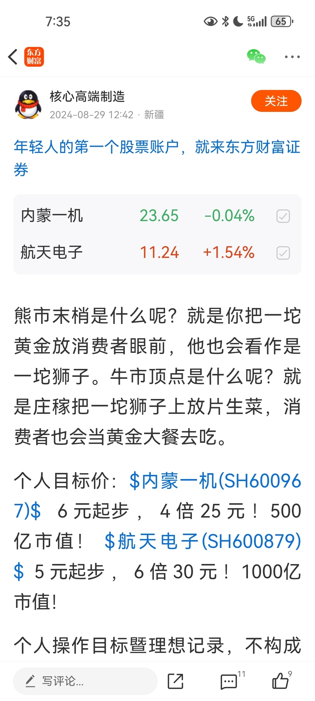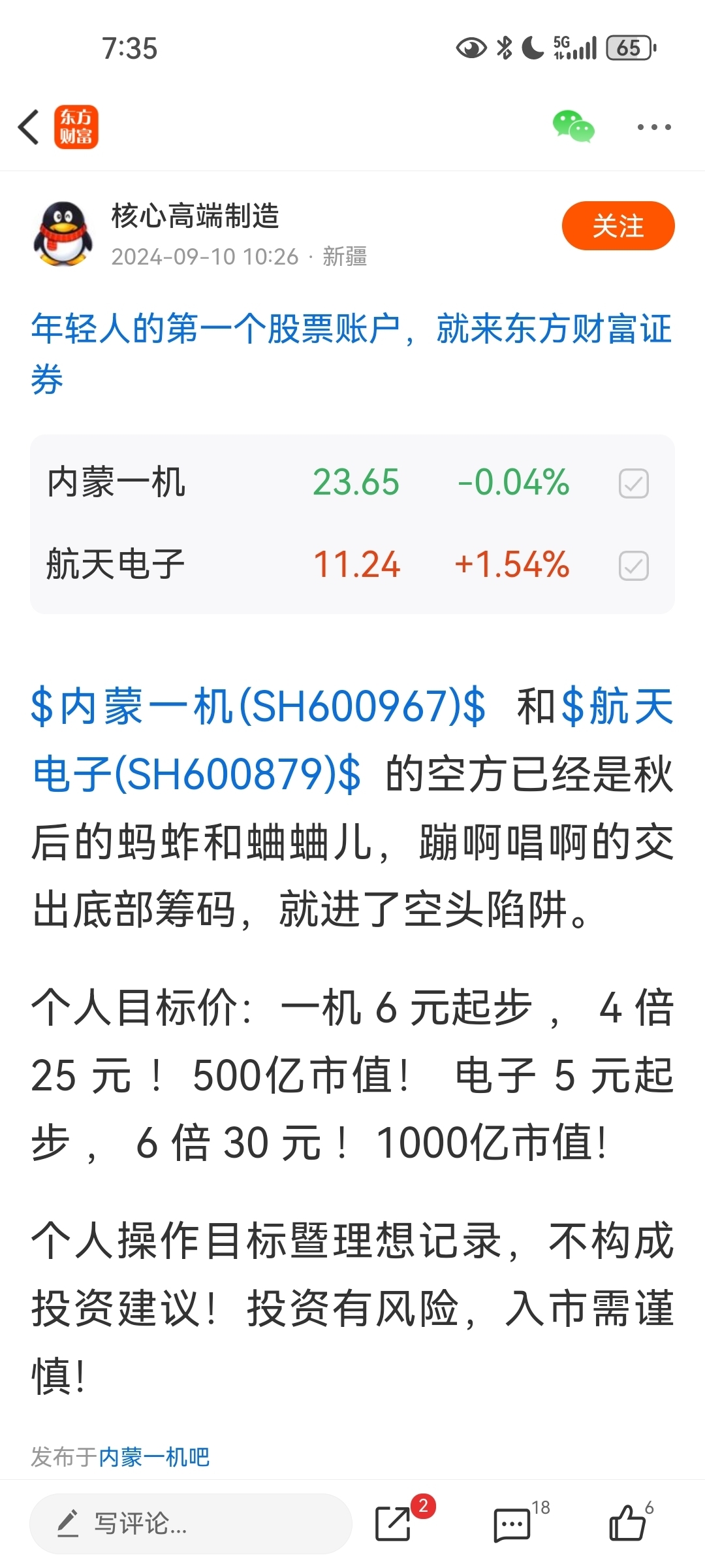 2024春夏熊市末梢设定内蒙一机目标价25航天电子30元。一机早已实现,电子也必将实现30目标价!