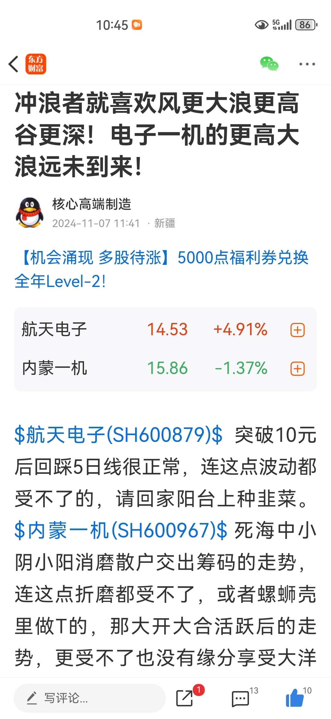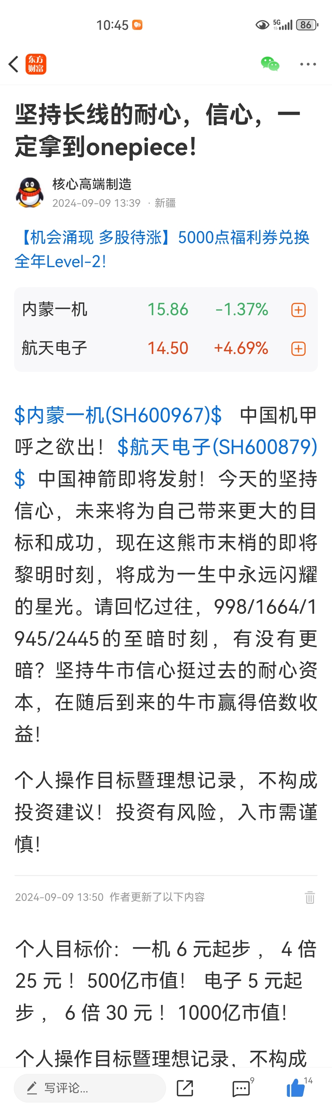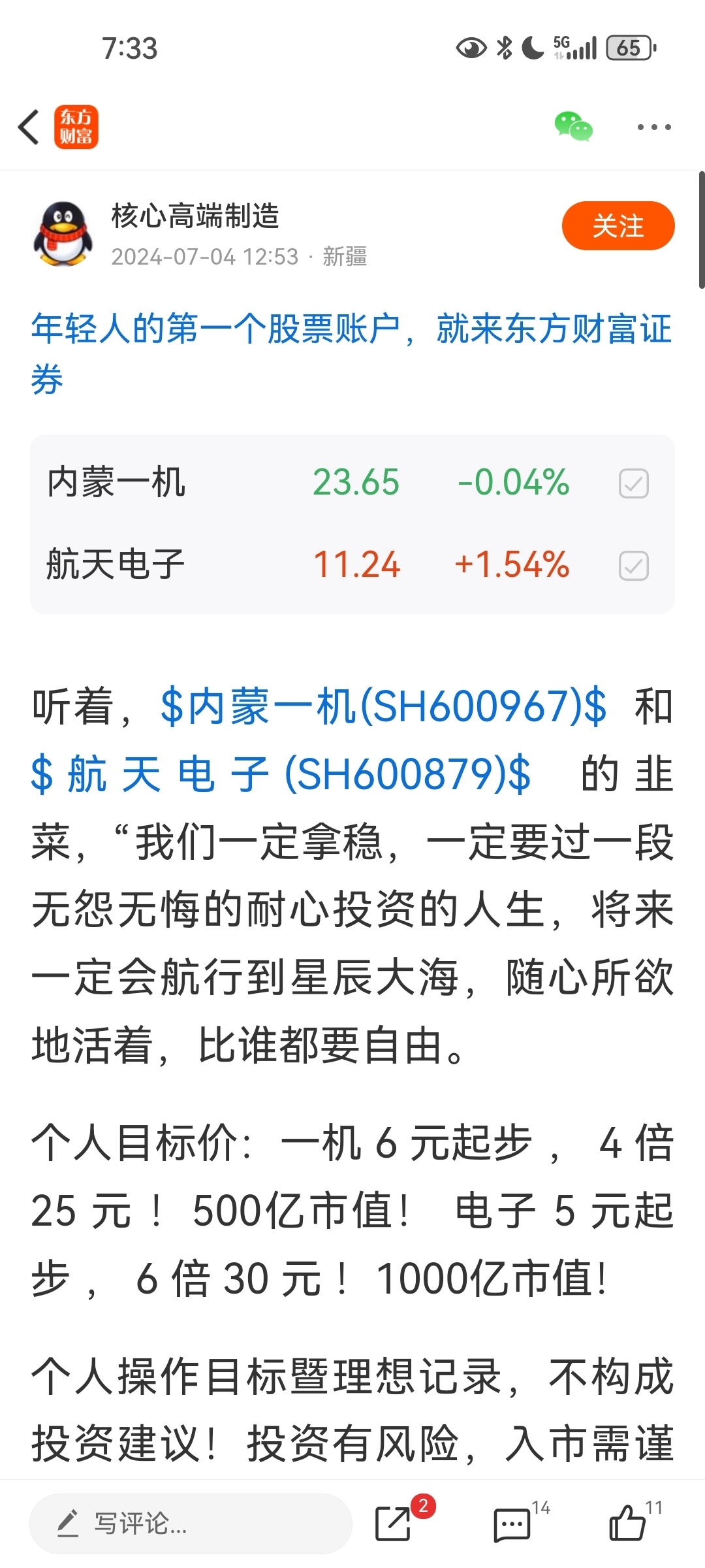2024春夏熊市末梢设定内蒙一机目标价25航天电子30元。一机早已实现,电子也必将实现30目标价!