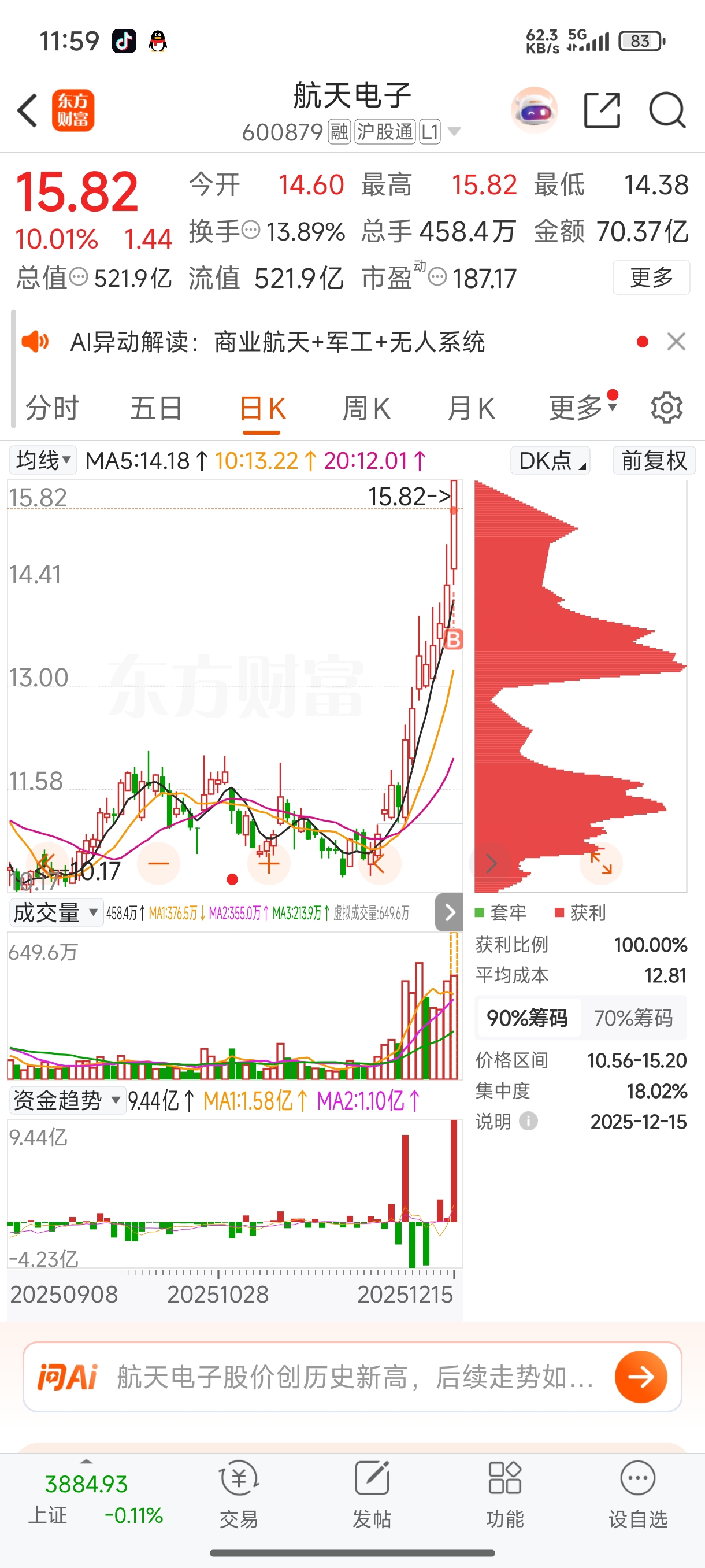 $航天电子(SH600879)$ 顺势买入半仓,看到20左右,20价位对应市值大约700亿,差不多了