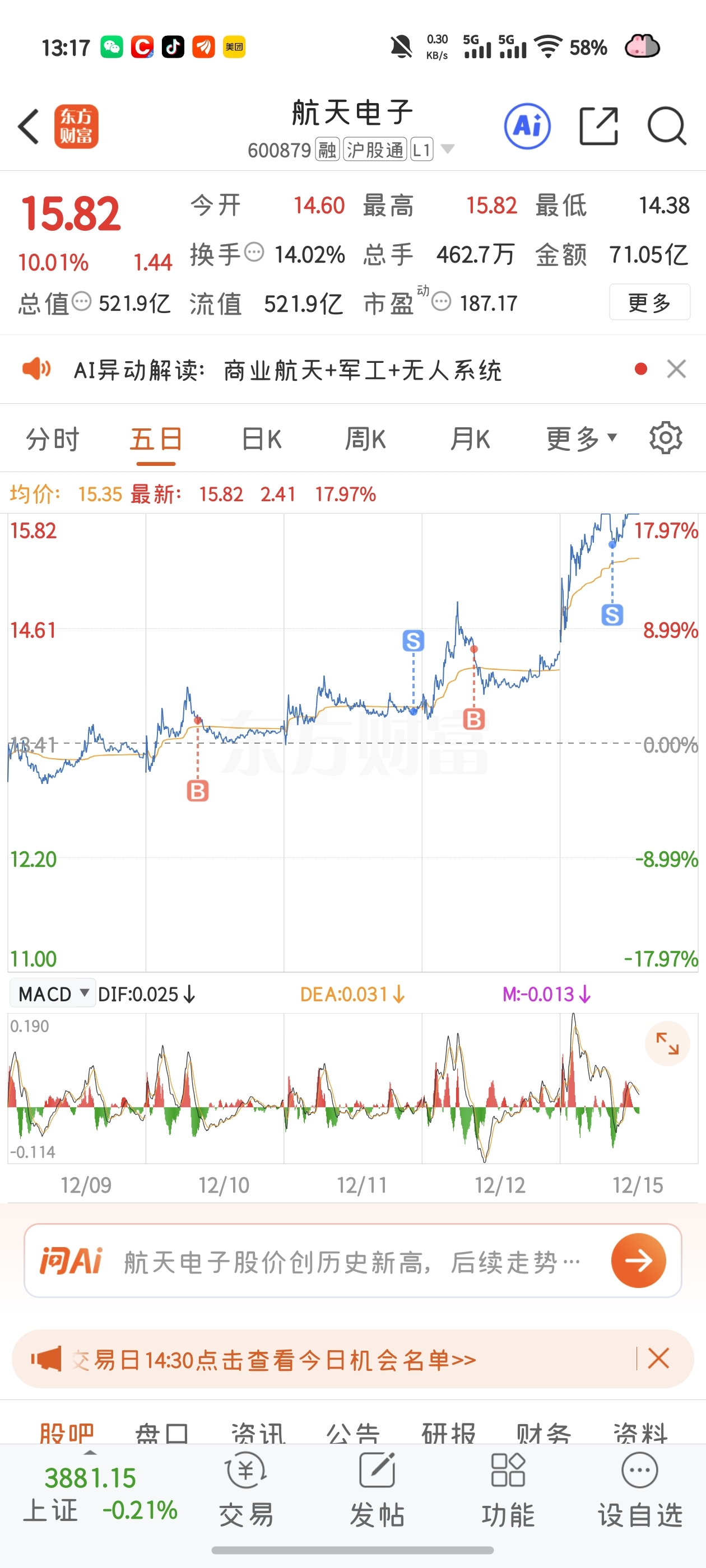 $航天电子(SH600879)$ 最蠢的就是我,明天应该还有溢价,又想重新买回来了