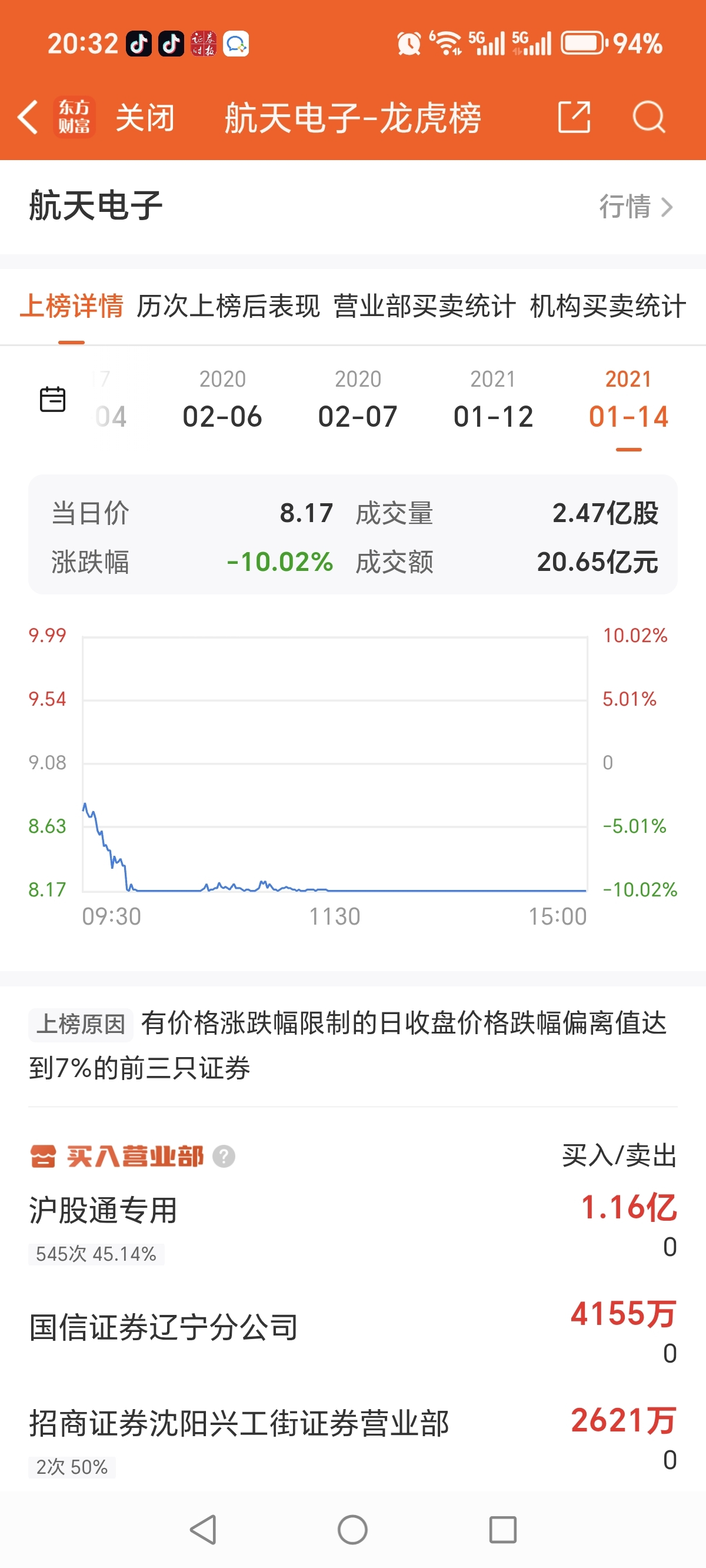 $航天电子(SH600879)$ 上次上龙虎榜还是遥远的2021年,还因为跌停上的