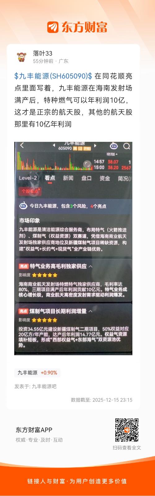 $九丰能源(SH605090)$ 在同花顺亮点里面写着,九丰能源在海南发射场满产后,特种燃气可以年利润10亿,这才是正宗的航天股,其他的航天股那里有10亿年利润