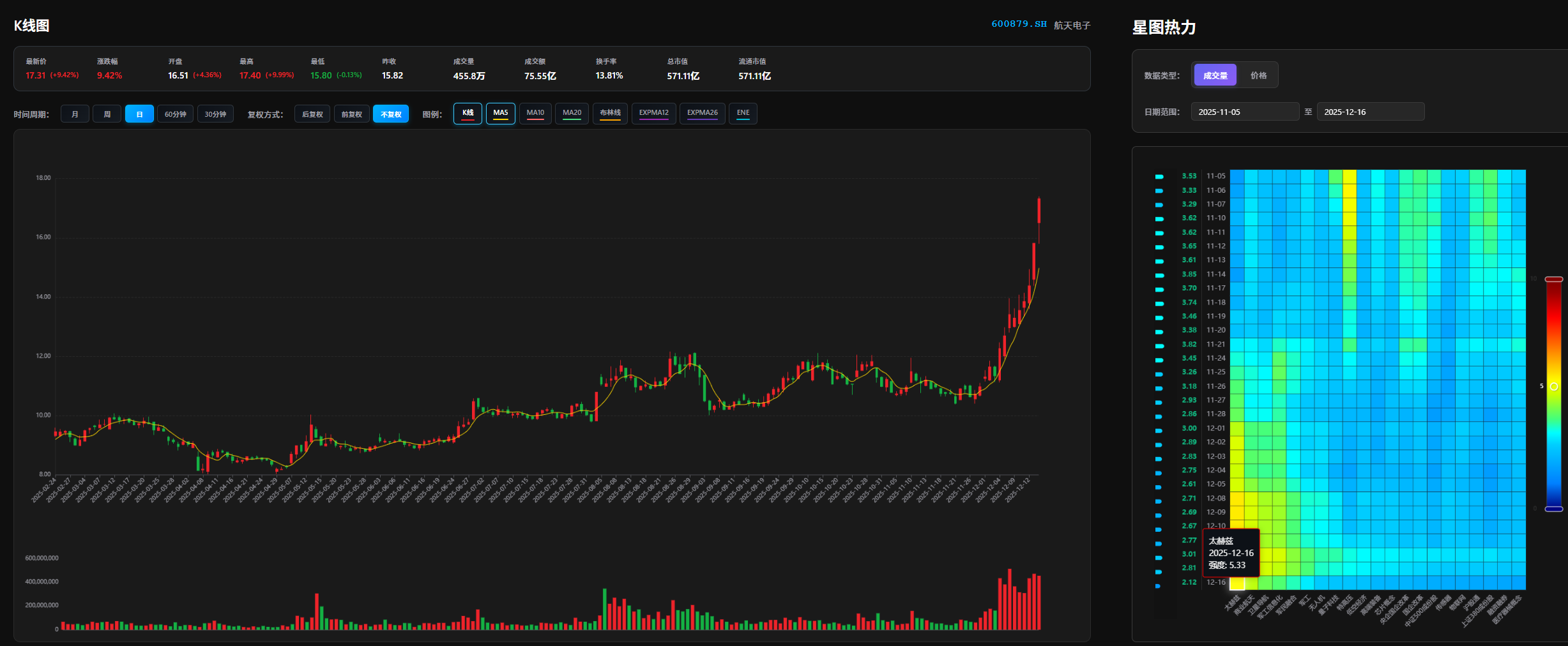 1.热力图左边数值显示大盘情绪至冰点,只有1.84,大家注意仓位。2.第二张航天