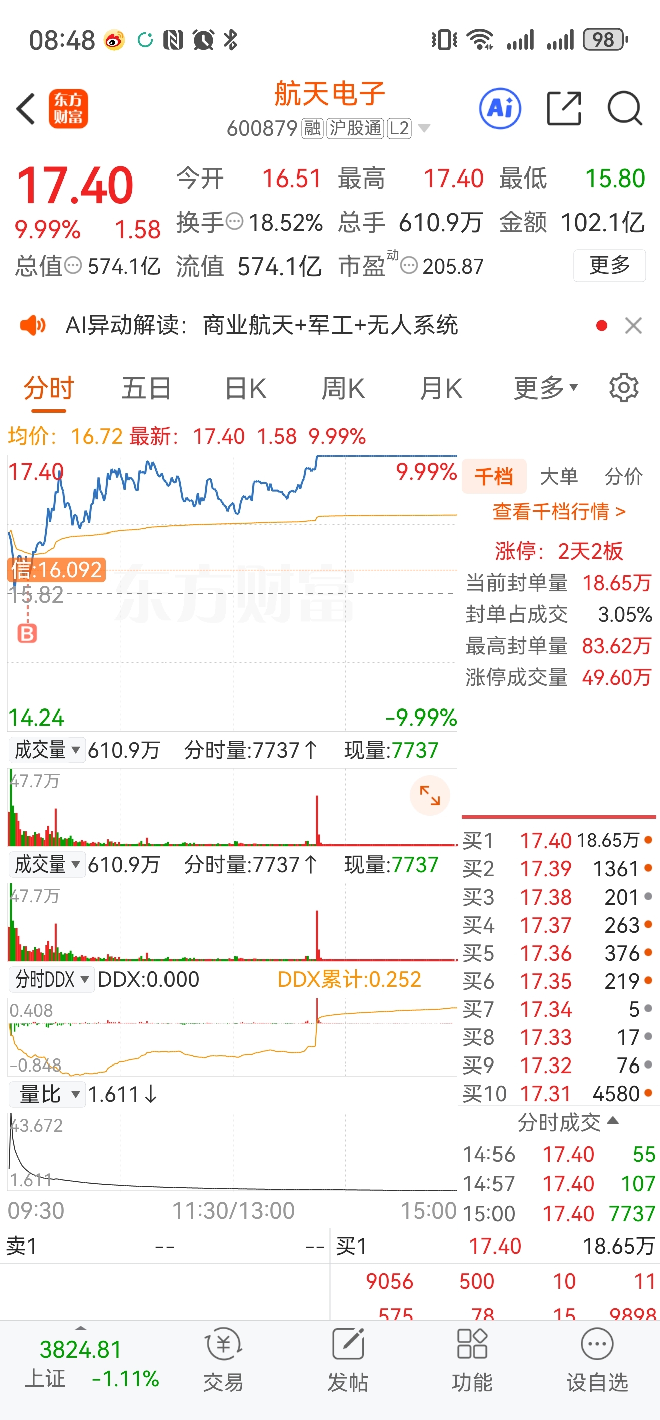 $航天电子(SH600879)$ 今天水下补了屯子。开盘进了航天电子,没想到跟小群总同车,实属是幸运的!感恩!也祝大家一路长红!