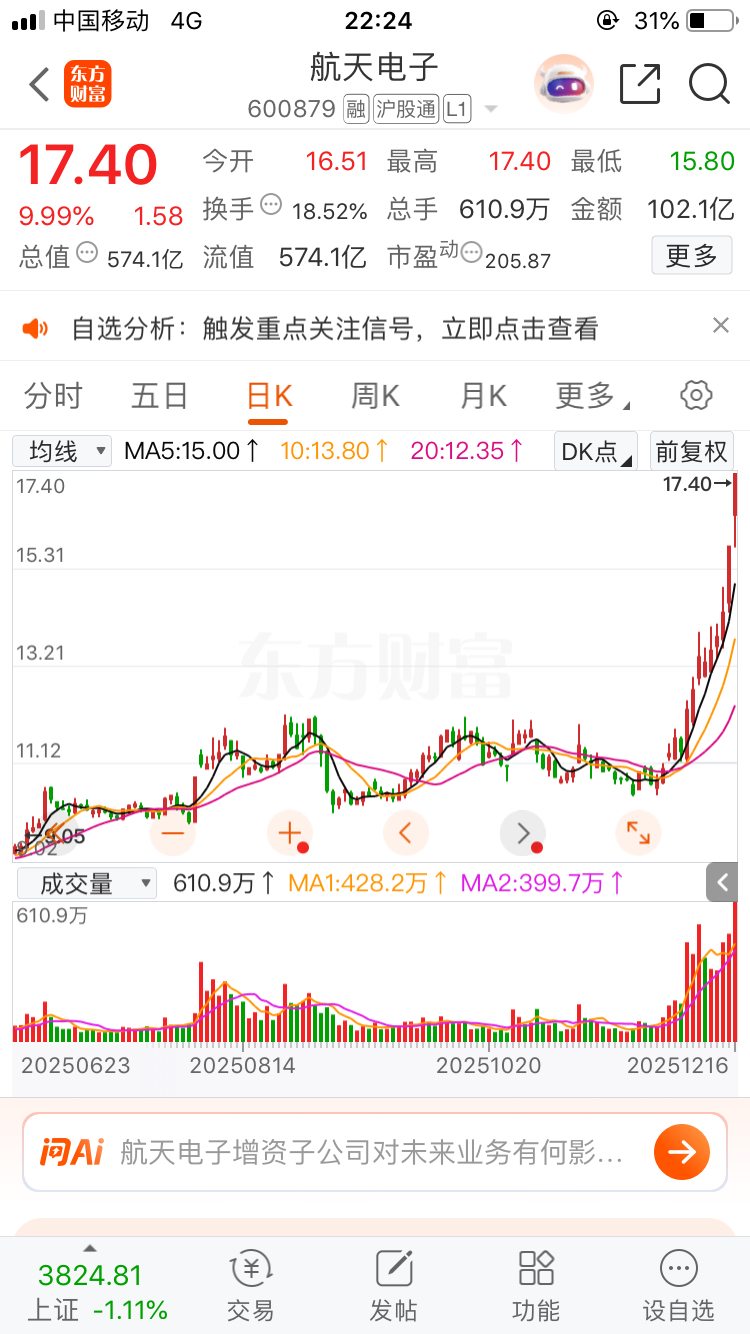 尾盘拉板,明天再咬一口顺势溢价,可以了,主升浪即将结束,明天将航天电子置底,很久