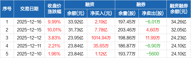 融资方面,当日融资买入16.56亿元,融资偿还14.37亿元,融资净买入2.19亿元,净买入额两市排名第八,连续5日净买入累计11.2亿元。融券方面,融券卖出3.08万股,融券偿还9.09万股,融券余量197.45万股,融券余额3435.63万元。融资融券余额合计34.26亿元。