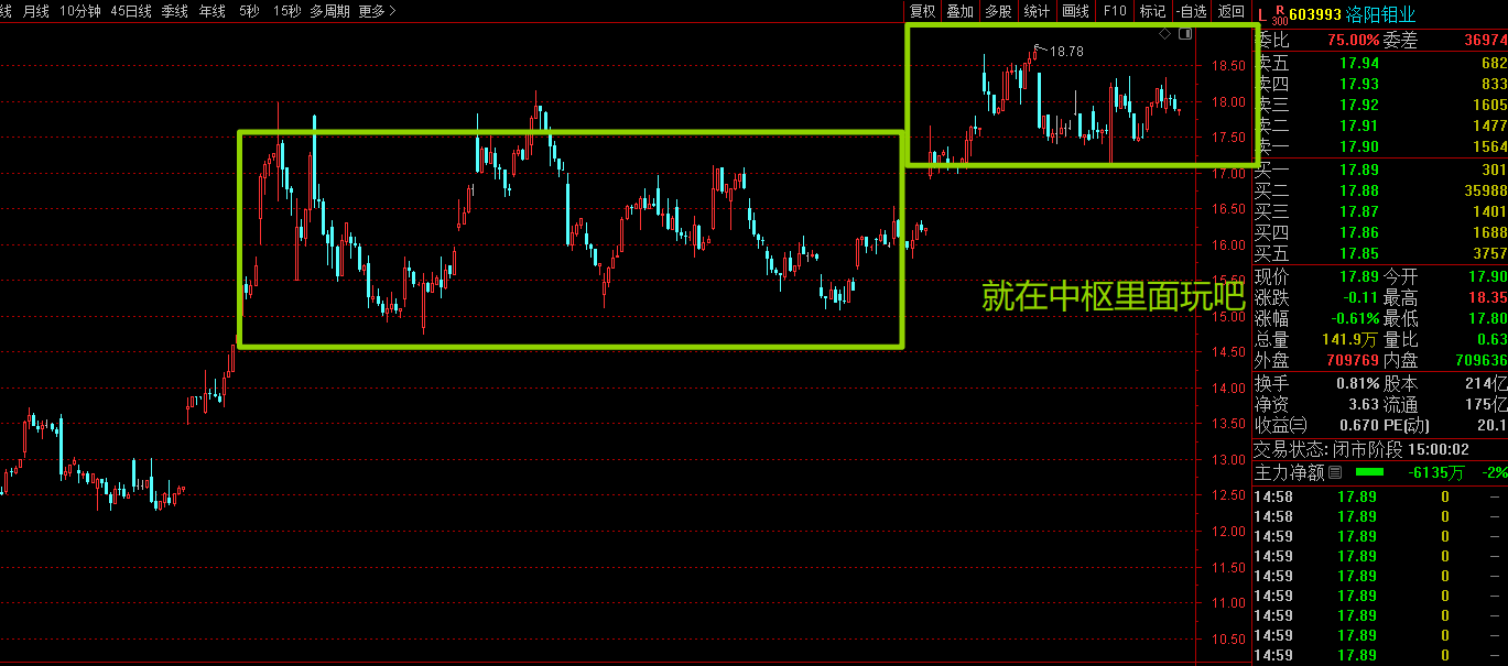 现在市场环境也不好啊,好在跟洛钼玩耍不亏米啊,他的走势也很简单,就是在中枢结构里玩耍,短期也是没有太大的波动,这个中枢结构运行周期还得要拉长了,具体什么时间去突破当下的中枢,现在也是很难预判,但是突破也是早晚的事了,它接下来的想法就是短期的波动不管了,静候佳音,等他突破就完了。