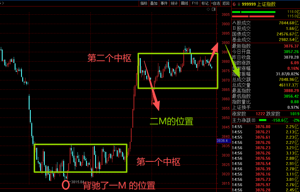这是昨天天早上缠哥从缠论的角度拆解指数的走势,今天指数调整正好是回踩到了3850的位置,这个位置也是指数标准的二M的位置,缠哥之前预判了指数一M的位置,今天也是精确预判了指数二M的位置吧。