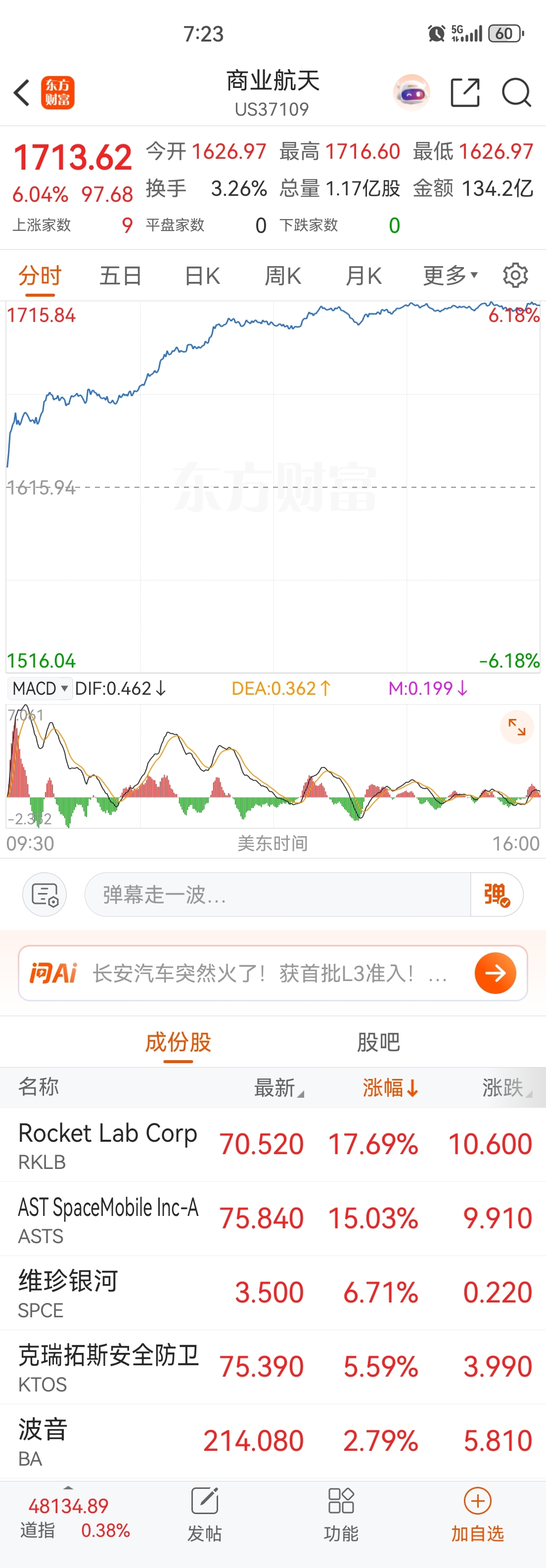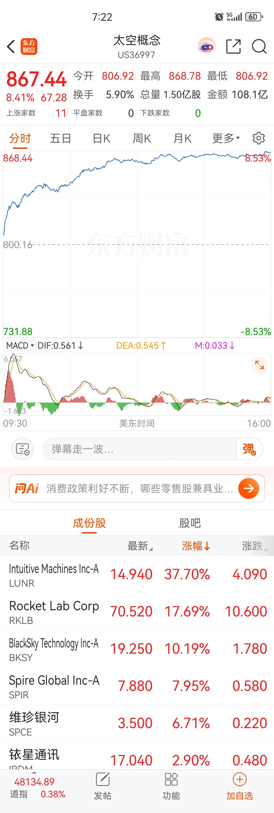 美股太空概念大涨8%,商业航天大涨6%,卫星和火箭制造分别大涨34%和17%,A