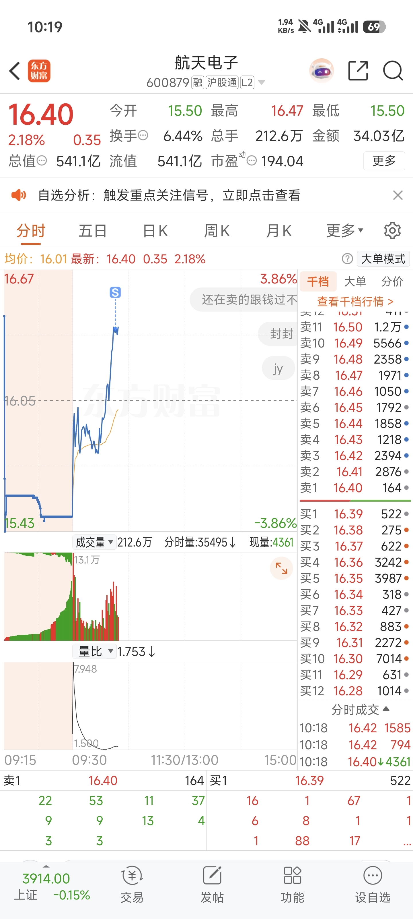 $航天电子(SH600879)$ 每天都是冲高回落,这次我知道跑了