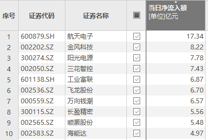 Choice数据显示,12月25日,资金净流入额排名前十的个股依次是航天电子、金风科技、阳光电源、三花智控、工业富联、飞龙股份、万向钱潮、长盈精密、顺灏股份、海能达。其中,航天电子、金风科技、顺灏股份等均为商业航天概念股。