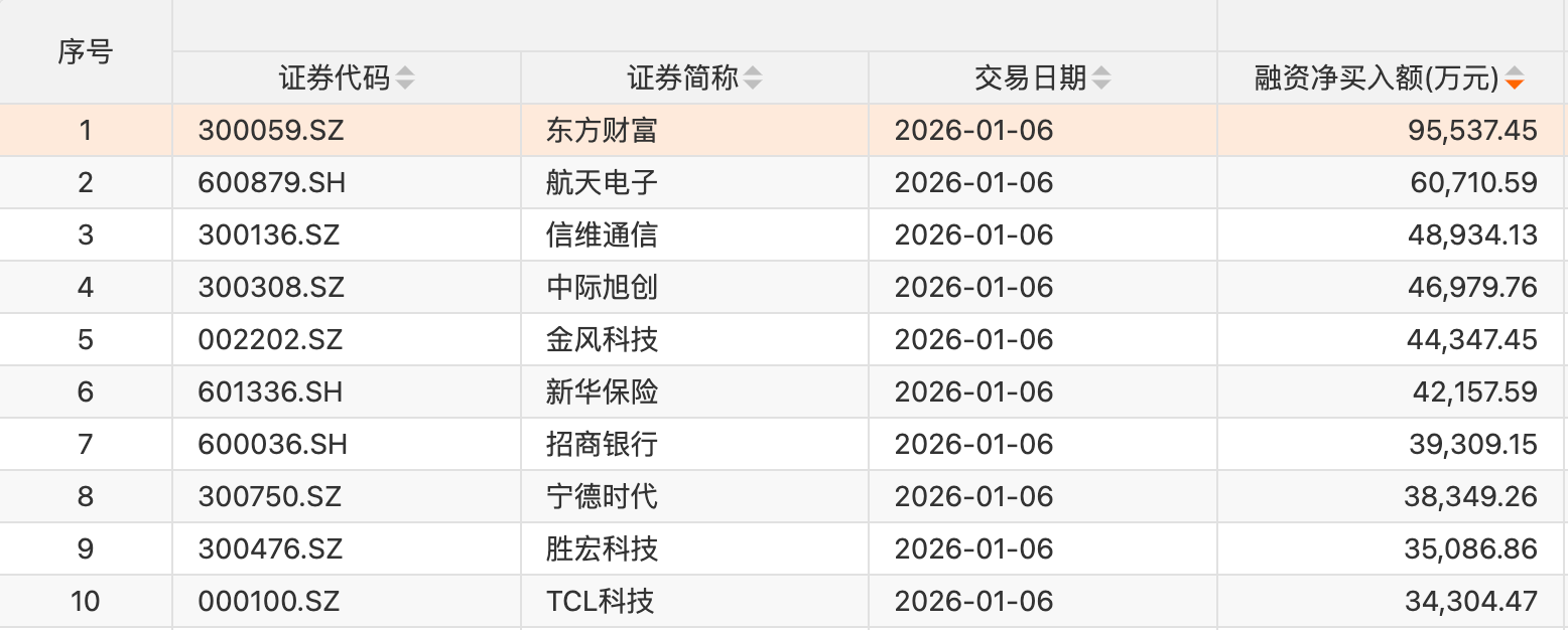 个股方面,74只个股获融资净买入额超1亿元。东方财富获融资净买入额居首,净买入9.55亿元;融资净买入额居前的还有航天电子、信维通信、中际旭创、金风科技、新华保险、招商银行、宁德时代、胜宏科技、TCL科技等。
