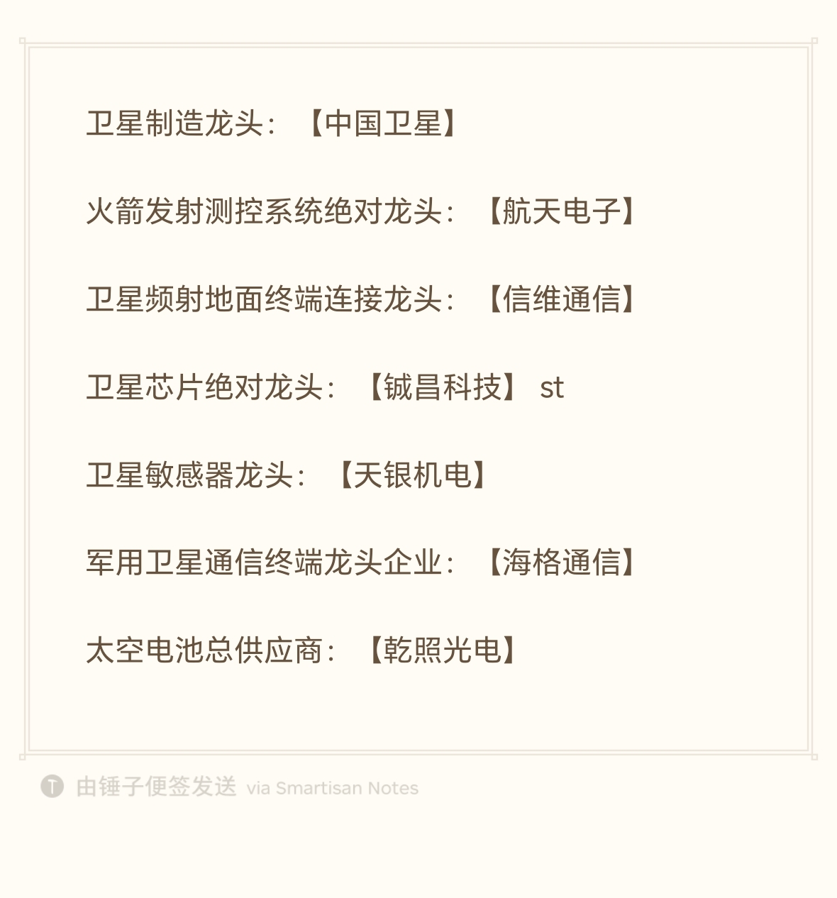 梳理了一些龙头,可以在这些里面来回做。卫星制造龙头:【中国卫星】火箭发射测控系统
