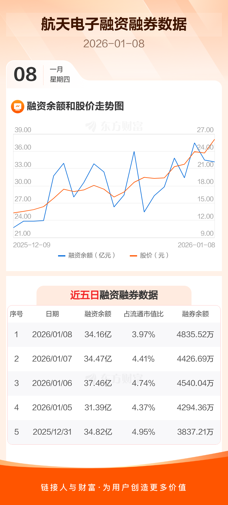 交易所最新数据显示,航天电子于2026年1月8日获融资买入10.00亿元,融资偿还10.31亿元,当日融资净偿还3071.32万元。目前,该股融资余额34.16亿,占流通市值比例为3.97%。