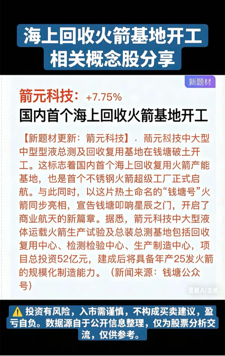 1月9日,周五A股这个板块有望大爆发!!!箭元科技国内首个海上回收火箭基地开工,
