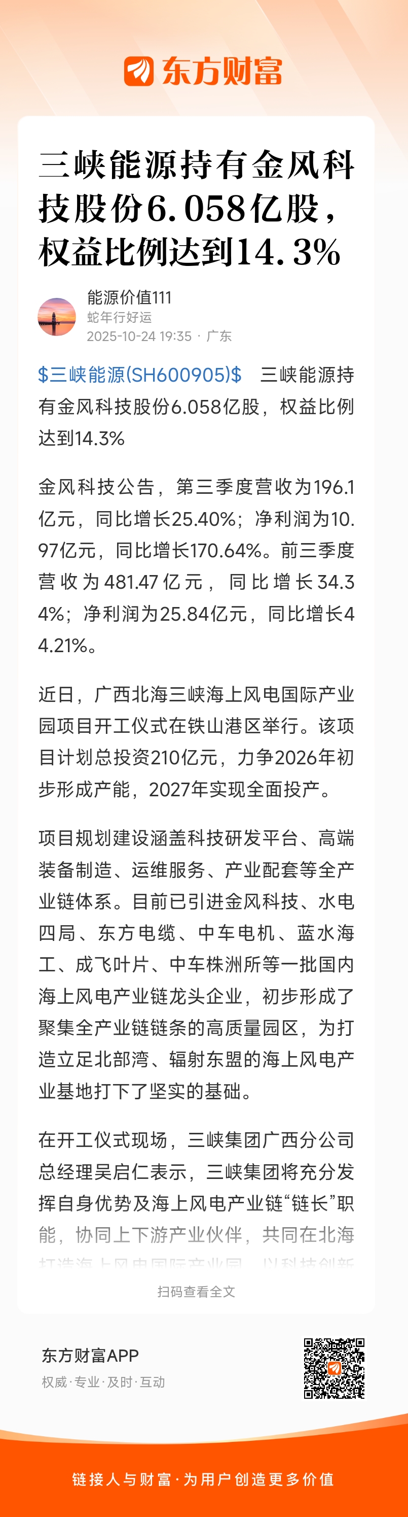 $三峡能源(SH600905)$ 三峡能源持有金风科技股份6.058亿股,权益比例达到14.3%