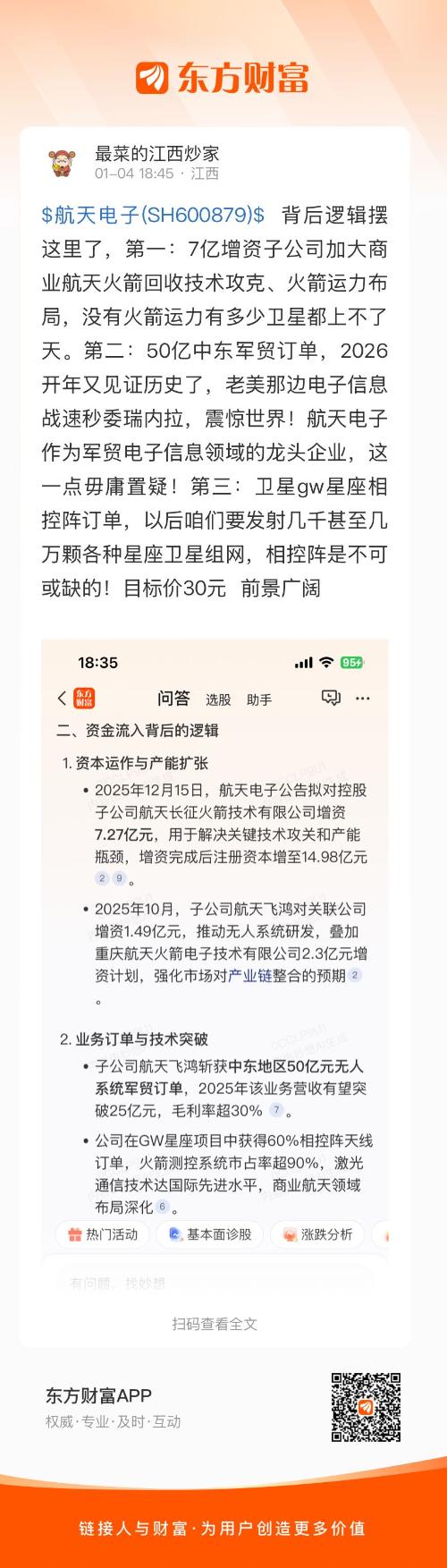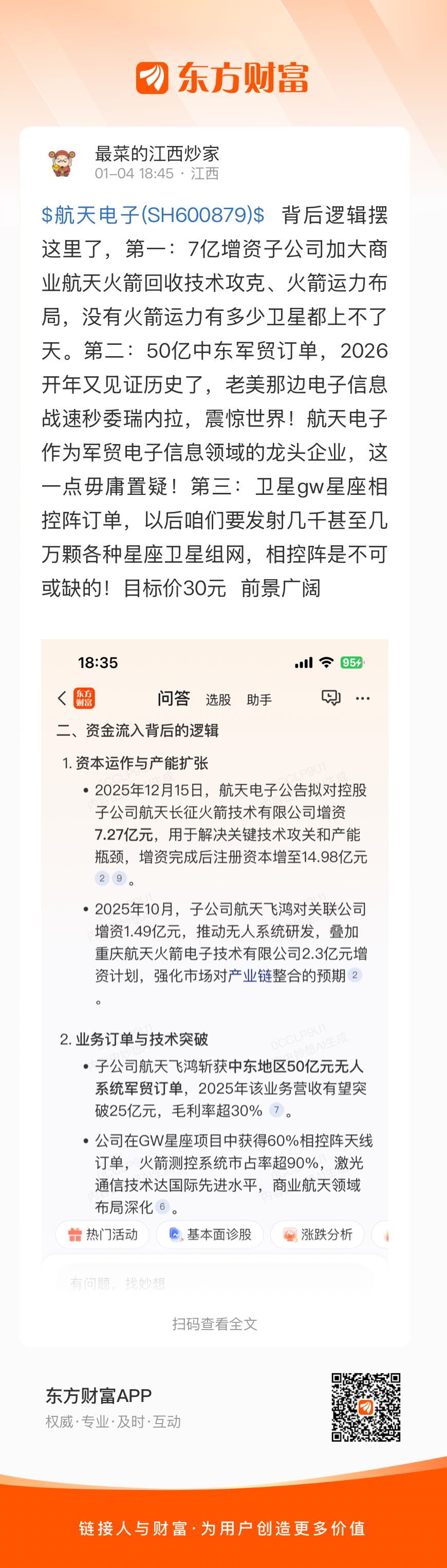 $航天电子(SH600879)$ 背后逻辑摆这里了,第一:7亿增资子公司加大商业航天火箭回收技术攻克、火箭运力布局,没有火箭运力有多少卫星都上不了天。第二:50亿中东军贸订单,2026开年又见证历史了,老美那边电子信息战速秒委瑞内拉,震惊世界!航天电子作为军贸电子信息领域的龙头企业,这一点毋庸置疑!第三:卫星gw星座相控阵订单,以后咱们要发射几千甚至几万颗各种星座卫星组网,相控阵是不可或缺的!目标价30元 前景广阔