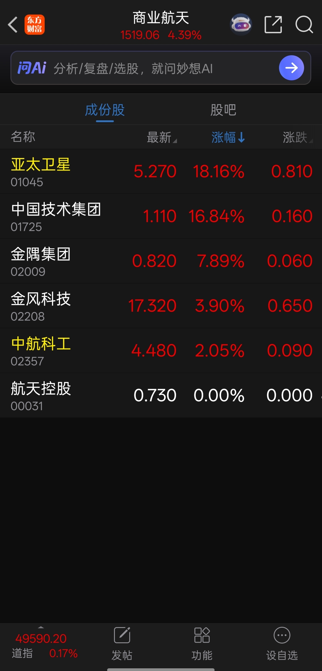 港股的商业航天没几个,而且低价低位,还是大a给力