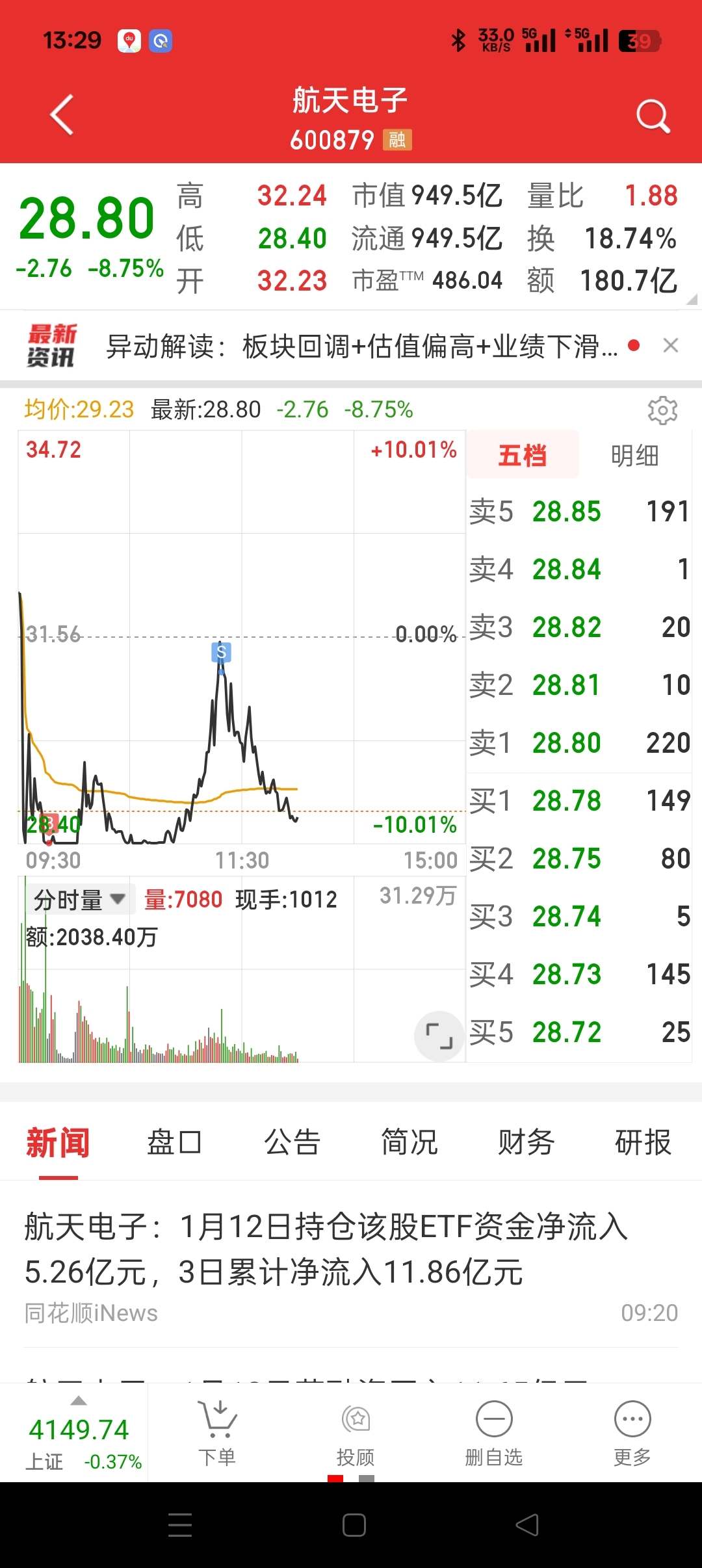 $航天电子(SH600879)$ 昨天高位进的,今天开盘也没有跑出来,跌停板又进高位出了成本降低了,想起来早盘还是该出来了