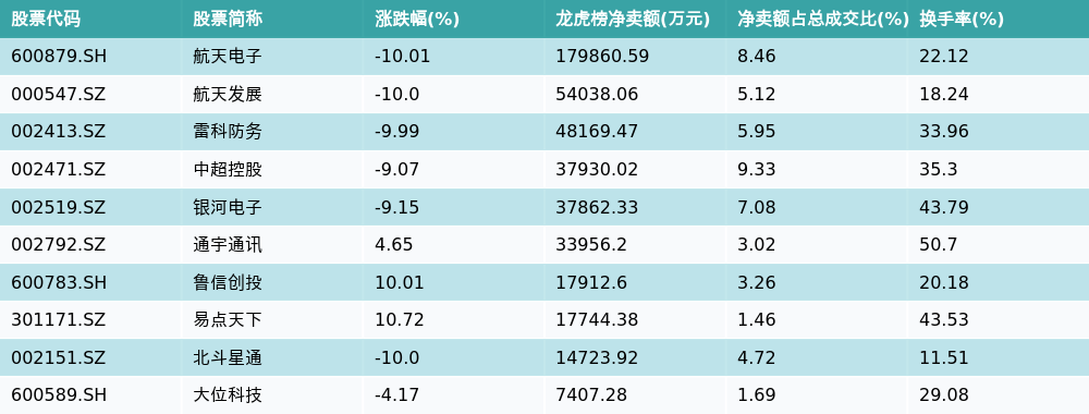 21智讯1月13日电,南财金融终端数据显示,因当日异动登上龙虎榜的个股中,龙虎榜中资金净流出最多的前三位分别是航天电子(600879.SH)、航天发展(000547.SZ)与雷科防务(002413.SZ)。其中排名第一的航天电子被净卖出17.99亿元,占总成交金额的8.46%。航天电子收盘下跌10.01%,换手率为22.12%。净卖出额前10个股详情见下图: