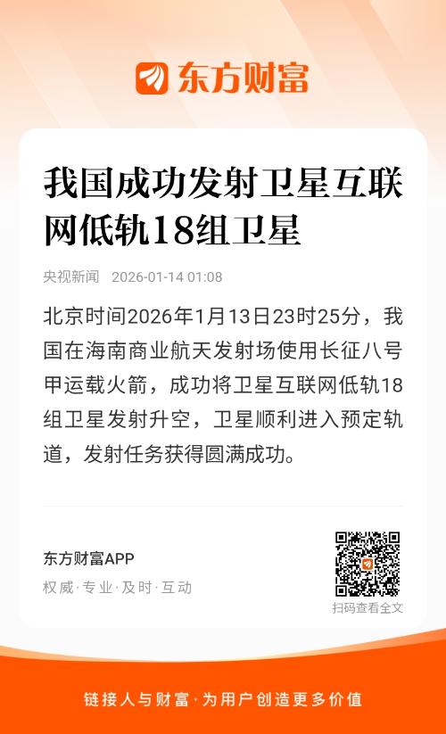 北京时间2026年1月13日23时25分,我国在海南商业航天发射场使用长征八号甲运载火箭,成功将卫星互联网低轨18组卫星发射升空,卫星顺利进入预定轨道,发射任务获得圆满成功。