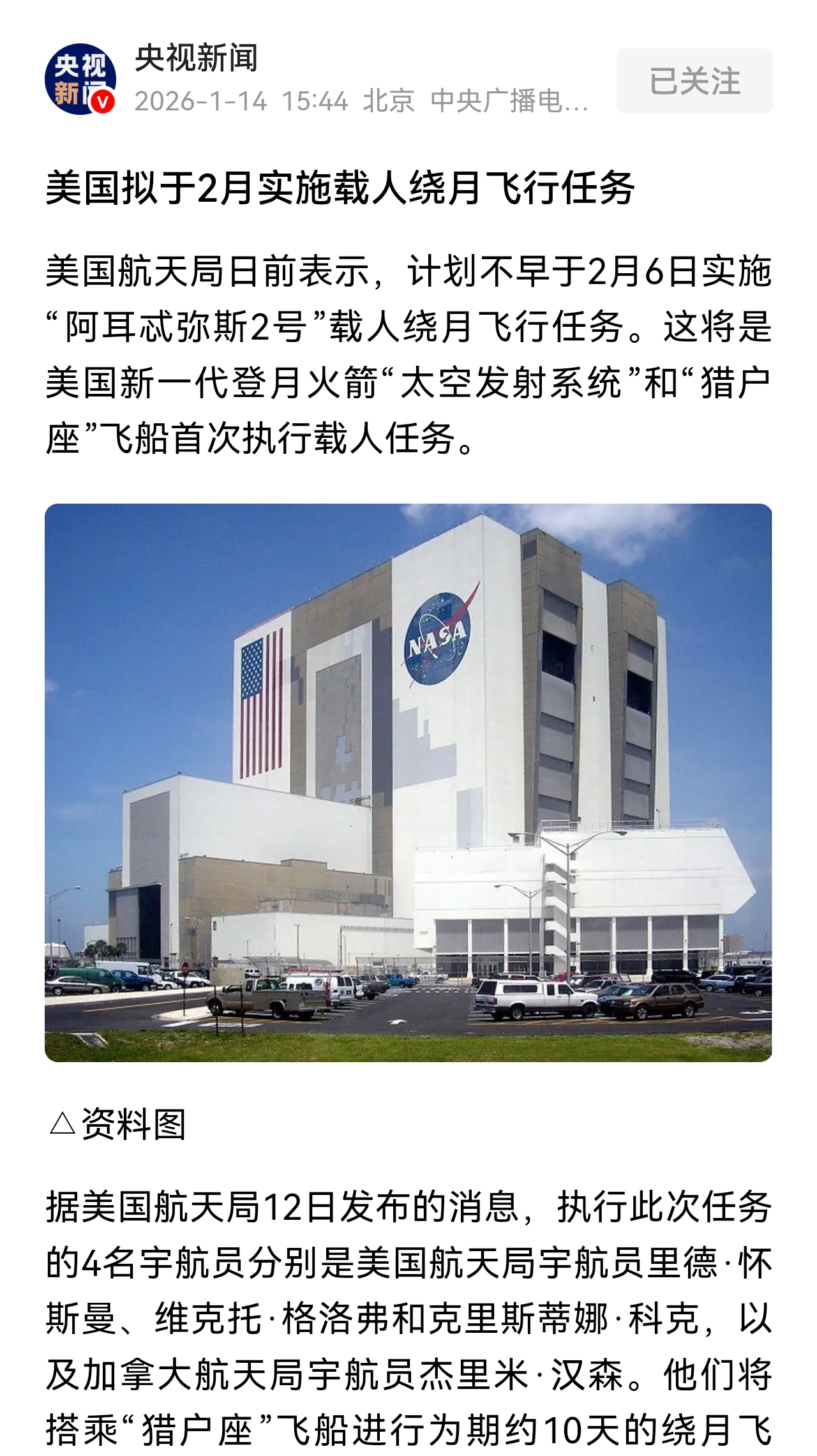 $航天电子(SH600879)$ 美国拟于2月实施载人绕月飞行任务