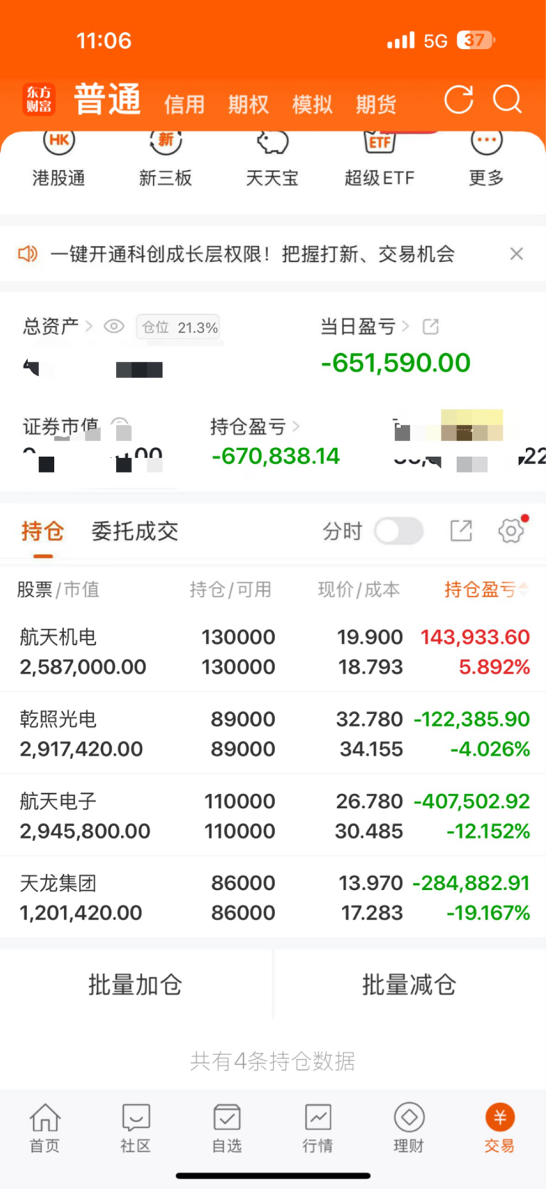各位老铁们,今天没有开新仓,出来混迟早要还,这次用受的苦,以后会加倍补偿给我们的,现在手里的天龙集团、航天电子天崩开局,怪自己过于贪婪没有控制好回调风险,乾照光电、航天机电 有少许的资金支撑,也是强弩之末,老铁们你们说我该何去何从?$航天电子(SH600879)$ $天龙集团(SZ300063)$ $航天机电(SH600151)$