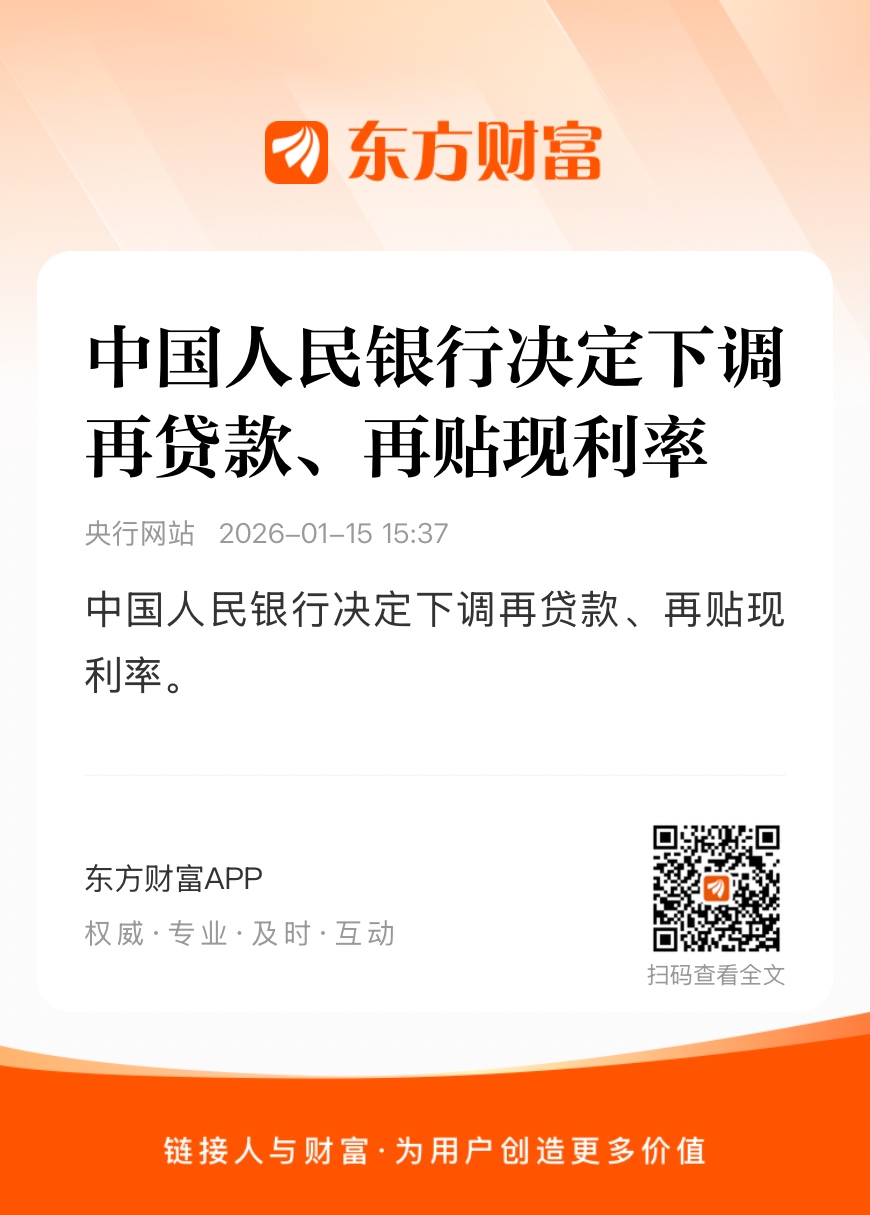 为更好发挥结构性货币政策工具的激励作用,引导金融机构加大对重大战略、重点领域和薄弱环节的支持力度,中国人民银行决定:自2026年1月19日起,下调再贷款、再贴现利率0.25个百分点。下调后,3个月、6个月和1年期支农支小再贷款利率分别为0.95%、1.15%和1.25%,再贴现利率为1.5%,抵押补充贷款利率为1.75%,专项结构性货币政策工具利率为1.25%。