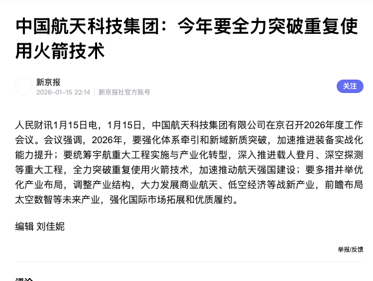 明天航天电子稳了,中国航天科技集团出来喊话了,2026年要全力发展商业航天,必须突破重复使用火箭技术!
