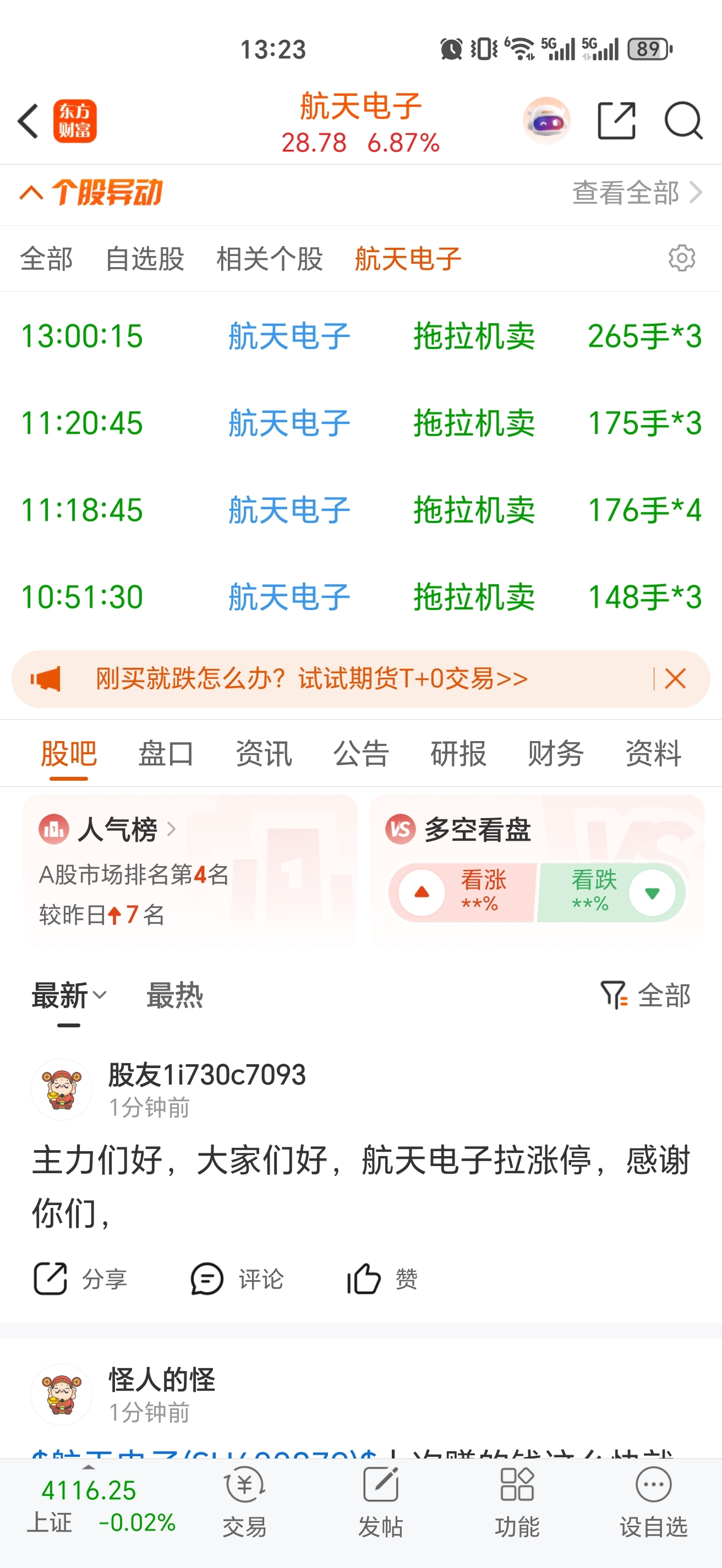 $航天电子(SH600879)$ 出现拖拉机卖单,是啥意思???