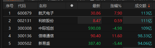 航天电子、利欧股份成交额突破110亿元