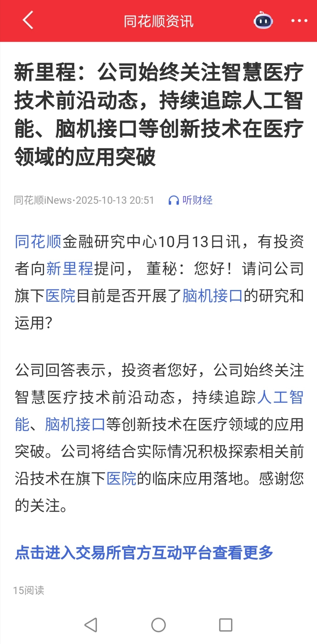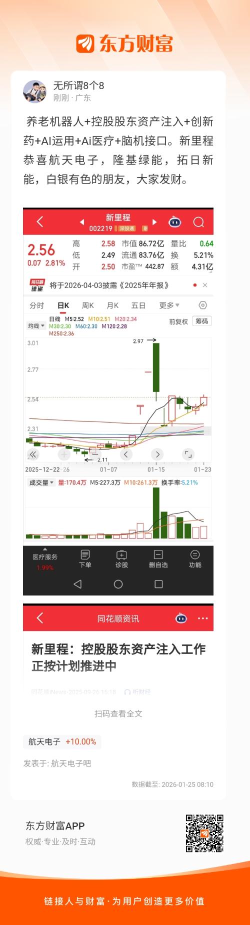 养老机器人+控股股东资产注入+创新药+AI运用+Ai医疗+脑机接口。新里程恭喜航天电子,隆基绿能,拓日新能,白银有色的朋友,大家发财。