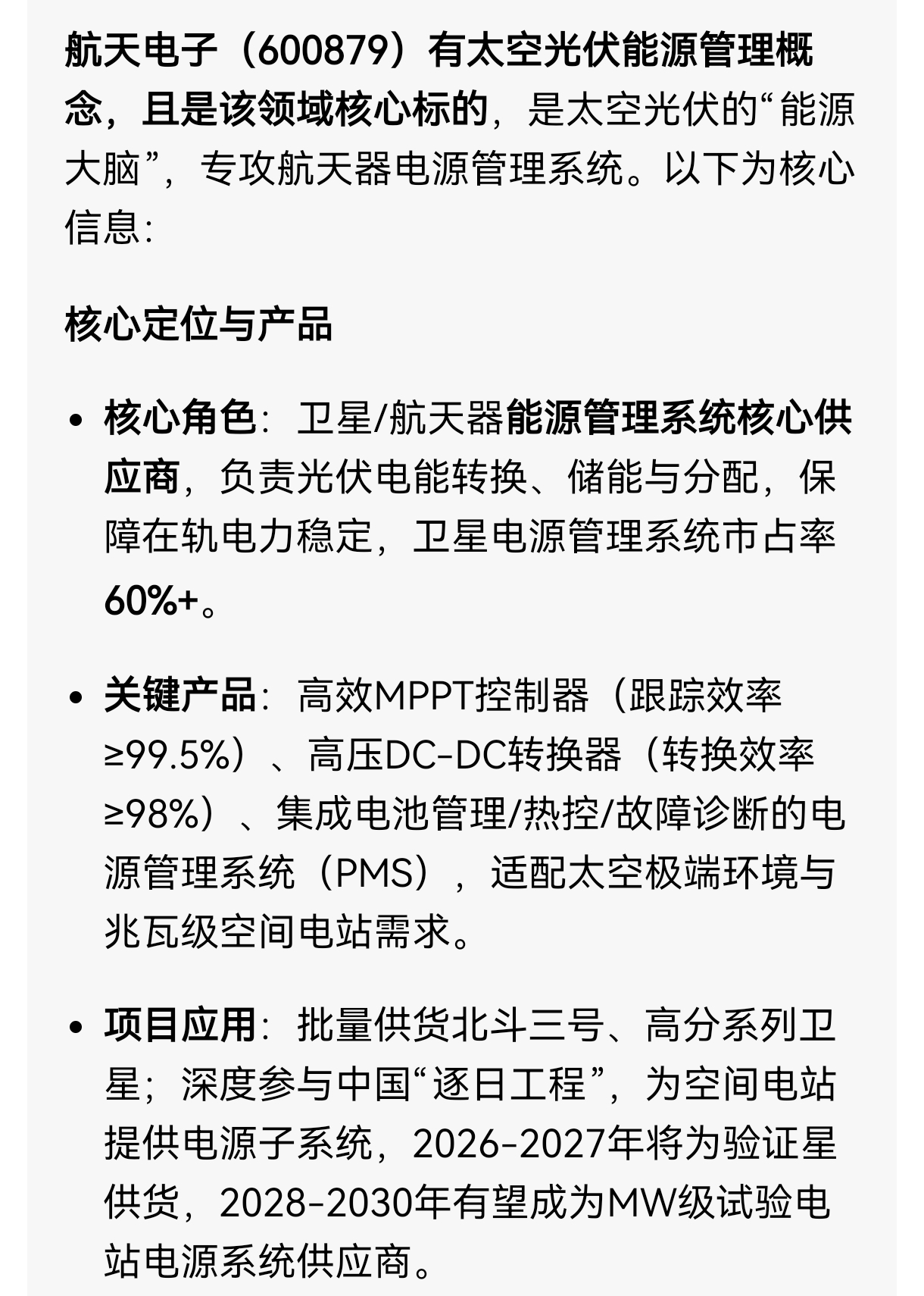 $航天电子(SH600879)$ 看看航天电子业务是做什么的,太空光伏大力发展,最重要的是什么?能少的了航电的“能源大脑”吗?那些光伏发电公司算的了什么?航电才是真正太空光伏的最核心标的