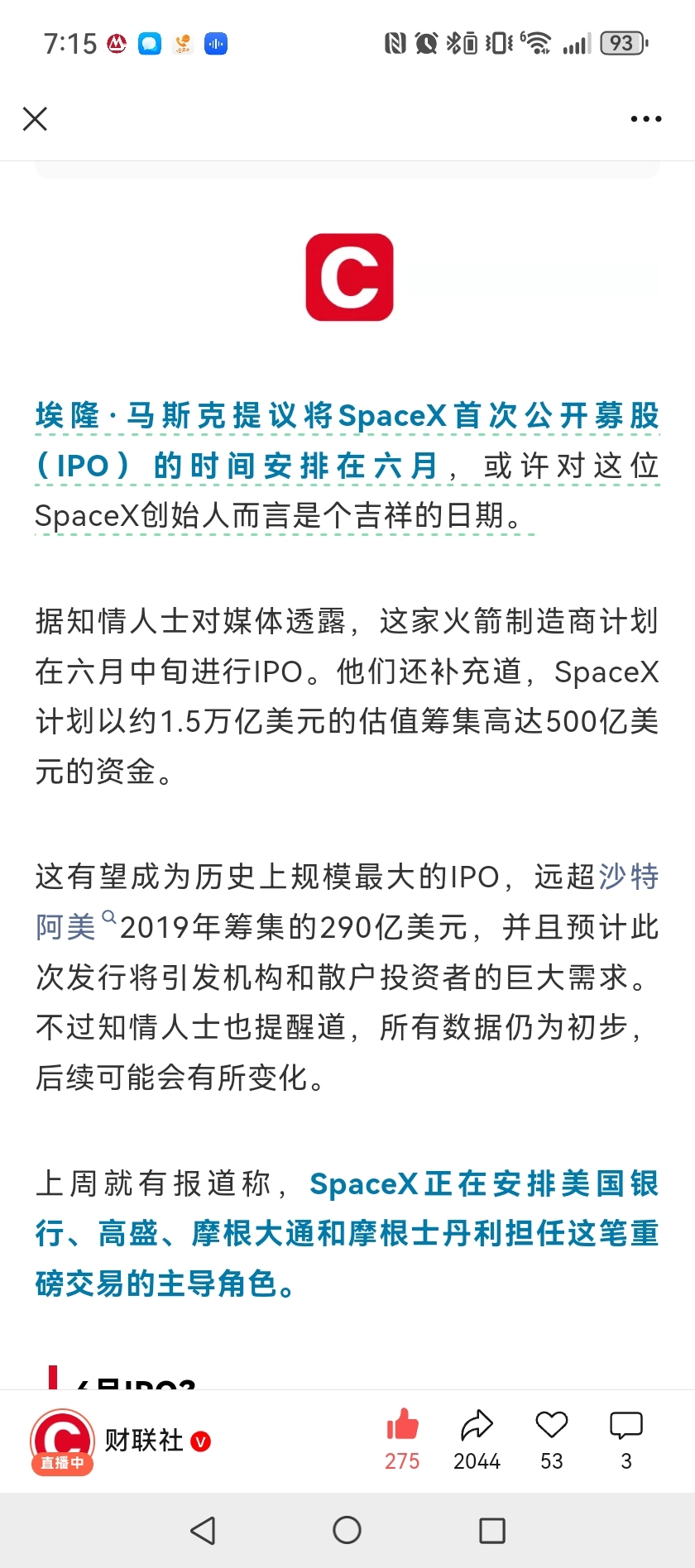 $航天电子(SH600879)$ Spacex六月准备IPO了。融到资以后,必然加速卫星入轨。时不我待啊,别人瞄准的是星辰大海,我们还在纠结击鼓传花。格局的差距是地球和火星的距离。