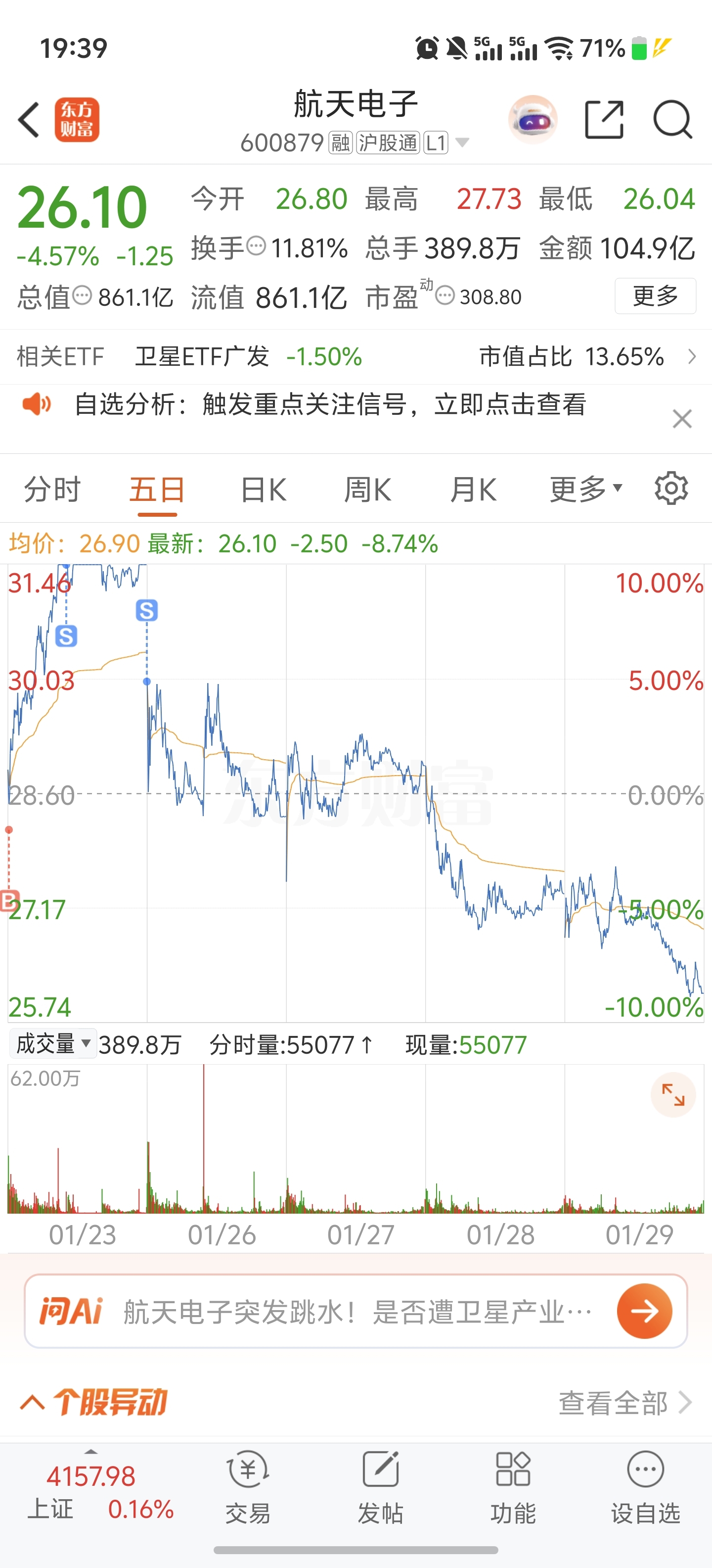 $航天电子(SH600879)$ 服了这董秘了,好不容易修复走二波了来个击鼓传花,上周五那么强周一直接按死,还好我跑的快,商业航天基本上每天都有利好,就是董秘的击鼓传花搞的都没人敢进了,进了就套,到今天板块破20日线了,个股也大部分破20日线了,黄金白银也加速这么久了,明天电子低开就接回来,也该反弹了