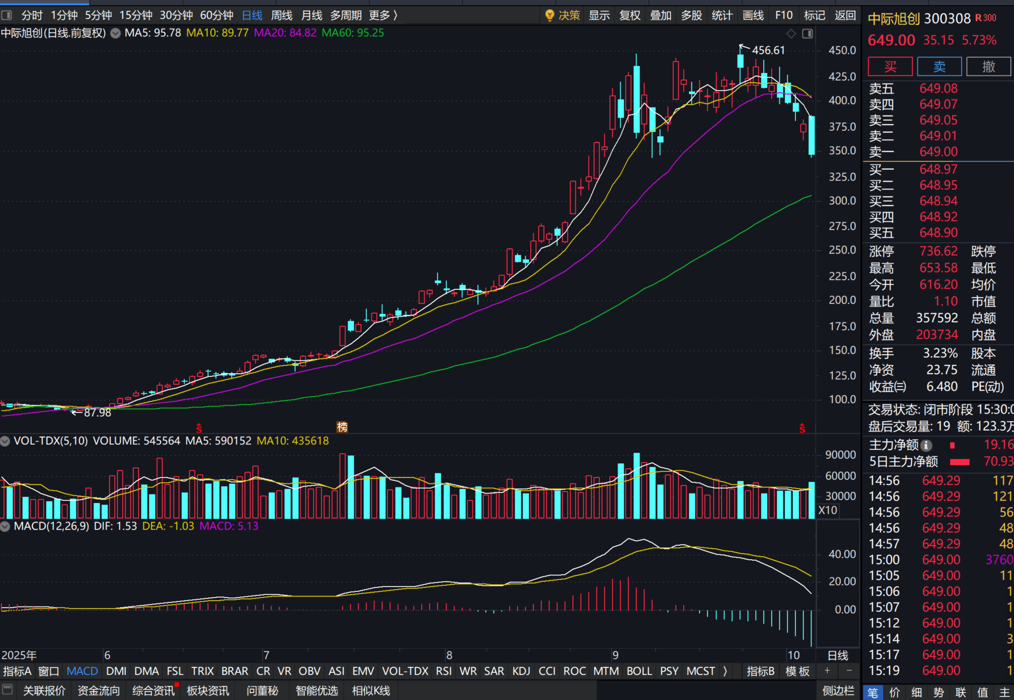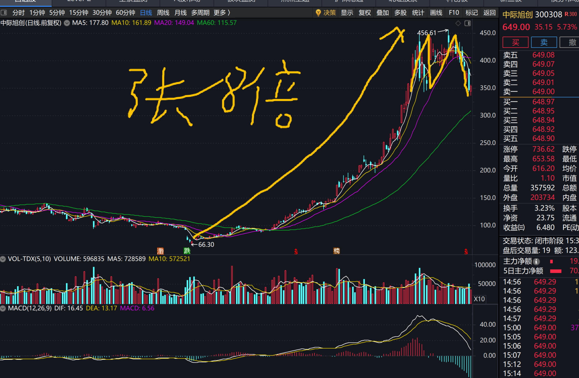 中际旭创300308涨了8倍后有人说是M头,要跌
