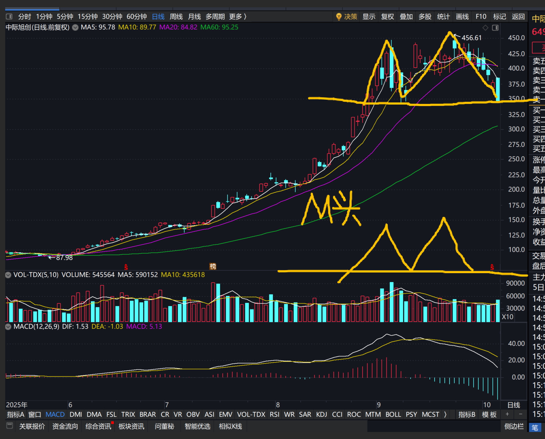 是M头还是W底?中际旭创300308涨了8倍后有人说是M头,要跌好吓人啊,看着要
