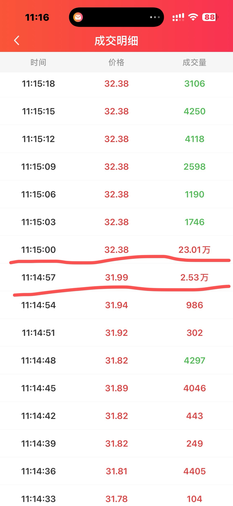 今天上午11:15有一大单23万手(7亿多元)在32.38元买入就直接把航天发展