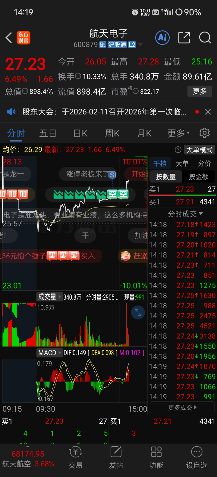 $航天电子(SH600879)$ 哎呦,看它横盘我就卖了,然后买了利欧和岩山,怎么我一卖你就起飞了?前面扛了好几天,你不涨,真的无语了