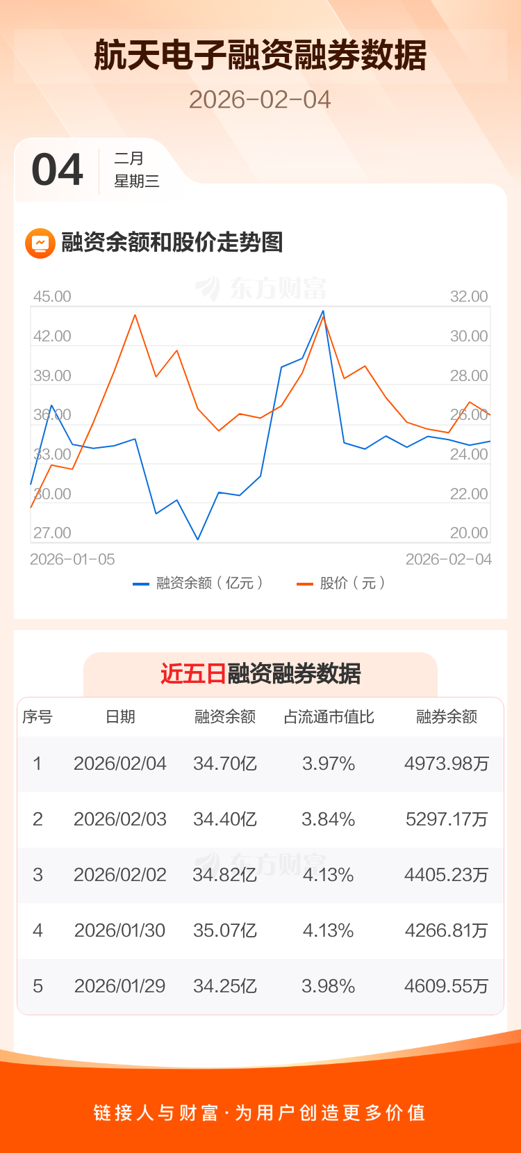 交易所最新数据显示,航天电子于2026年2月4日获融资买入6.14亿元,融资偿还5.83亿元,当日融资净买入3018.22万元。目前,该股融资余额34.70亿,占流通市值比例为3.97%。