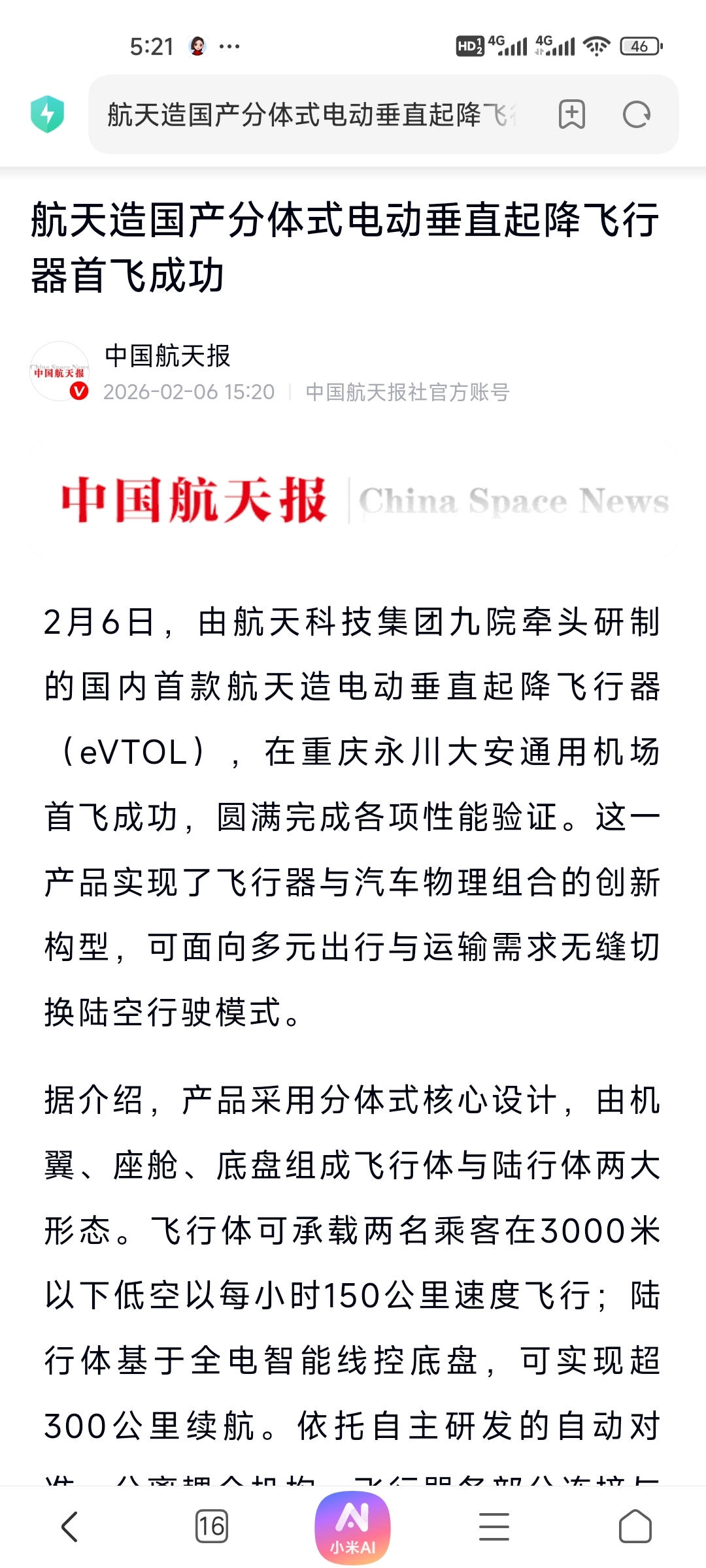 $航天电子(SH600879)$ 这个算盘后利好吗? 全国首款航天造电动垂直起降飞行器首飞成功:今天,由中国航天科技集团九院研制的全国首款航天造电动垂直起降低空飞行器,在重庆永川大安机场首飞成功,圆满完成各项性能验证。