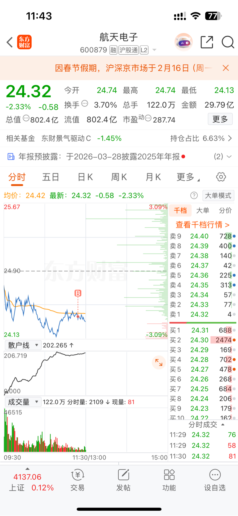 $航天电子(SH600879)$ 大家中午好,我来抄底了